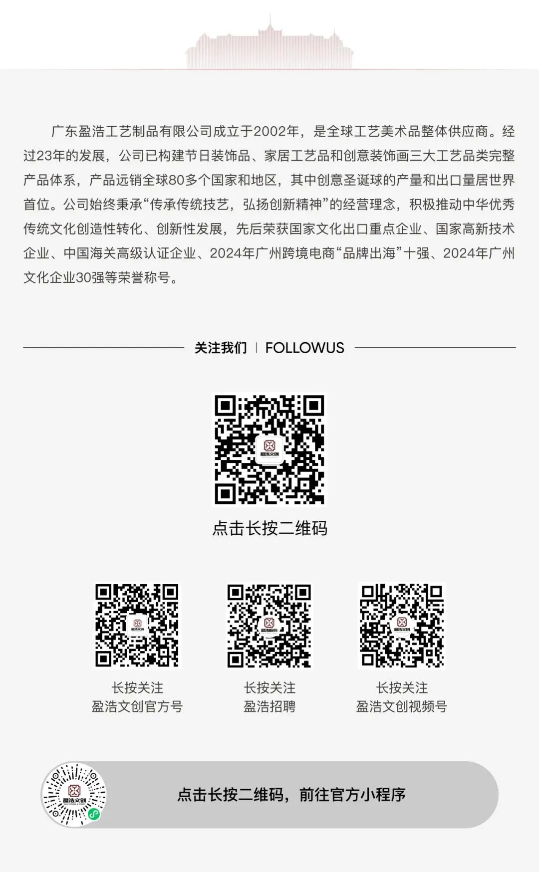 在罗总的陪同下,来宾一行参观了广东盈浩的产品展厅与企业文化长廊,深入了解了企业在工艺研发、设计创新、生产制造及市场拓展等方面的探索与成果。参观过程中,大家对盈浩在产品设计及文化融合中展现的独特创意与匠心精神给予了高度评价,一致认为其产品兼具艺术审美与实用价值,极具市场潜力。