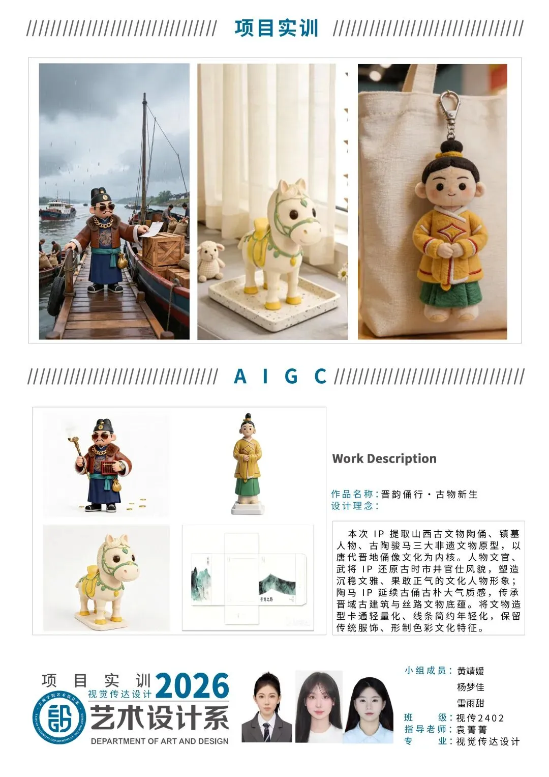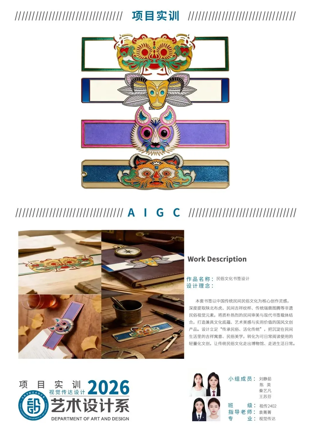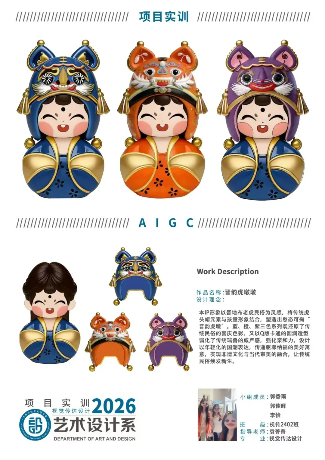 本课程要求学生通过两周的集中学习,以山西地方民俗文化为核心创作载体,引导学生深度参与真实设计项目实践,帮助学生精准把握视觉传达设计行业的评判标准与应用规范。通过项目化专题训练,学生对前期课程积累的理论知识、专业技能与实践经验进行系统整合与综合提升,有效激发学习主动性与创作热情。在围绕山西地方民俗文化开展的项目化设计练习中,切实培养学生综合运用专业知识进行命题创作与落地实践的应用能力。