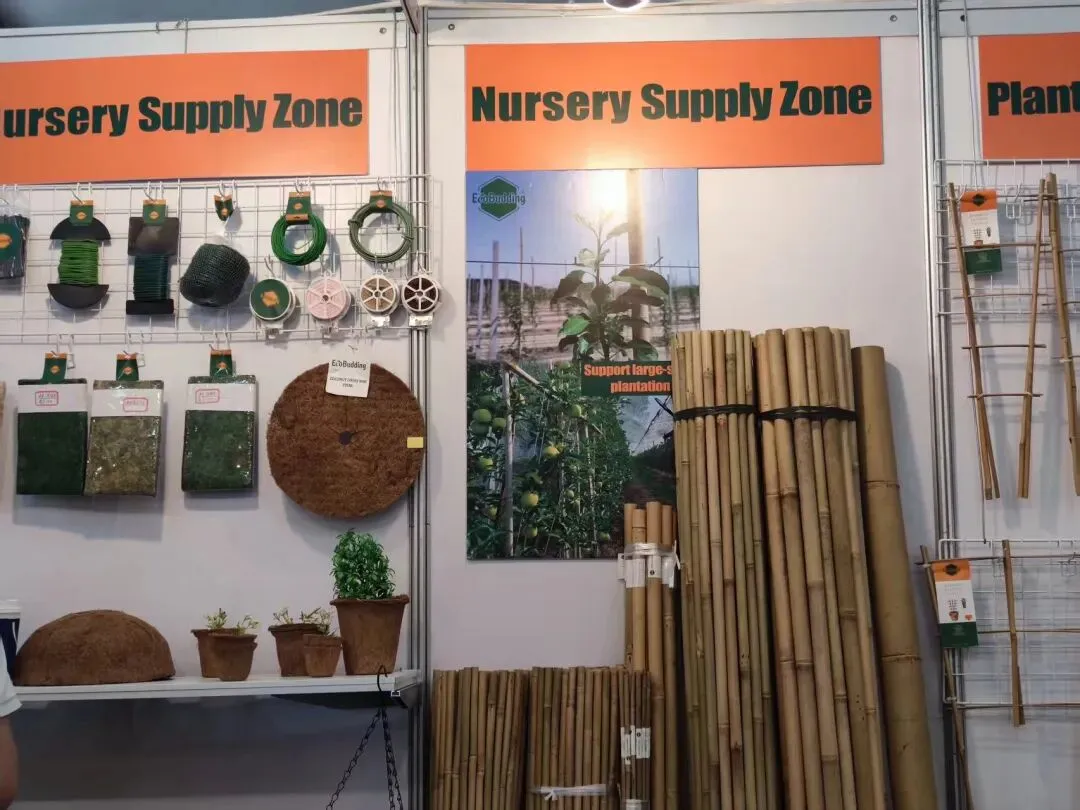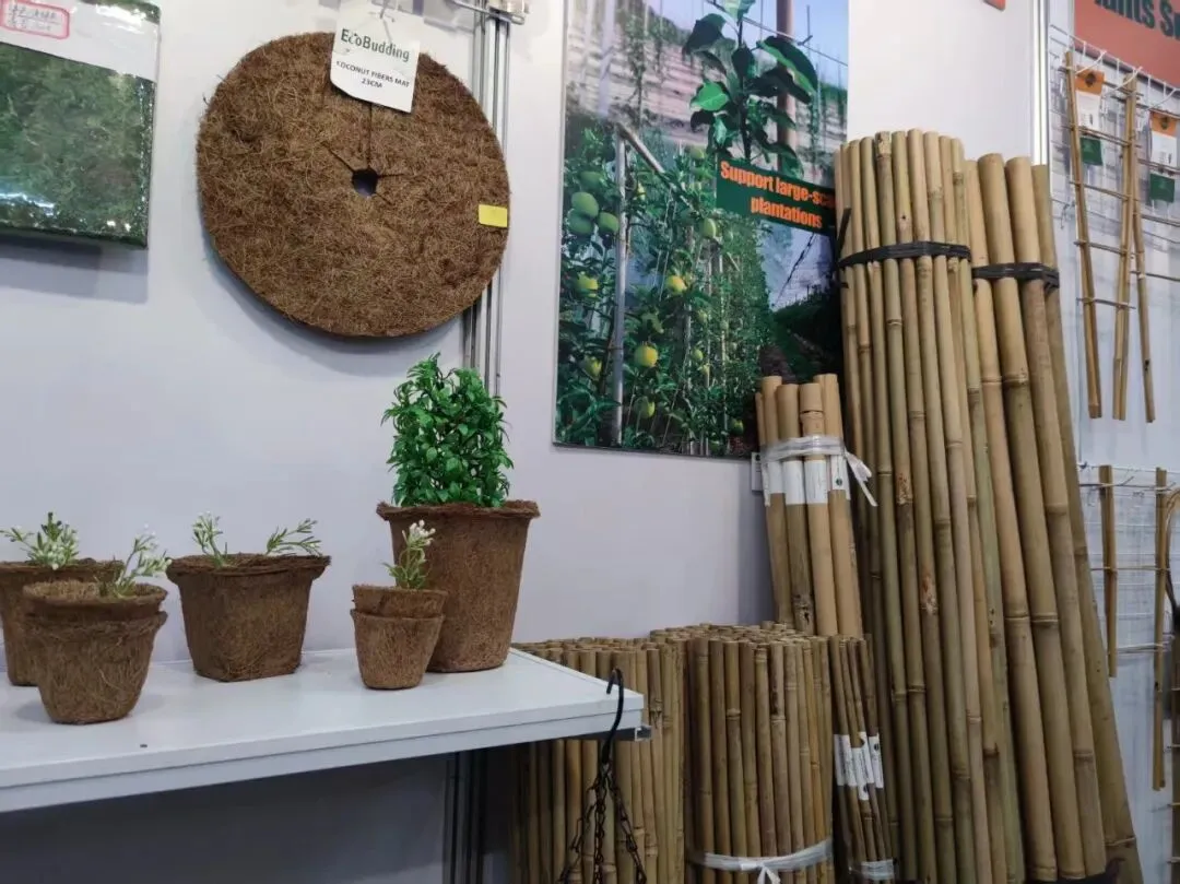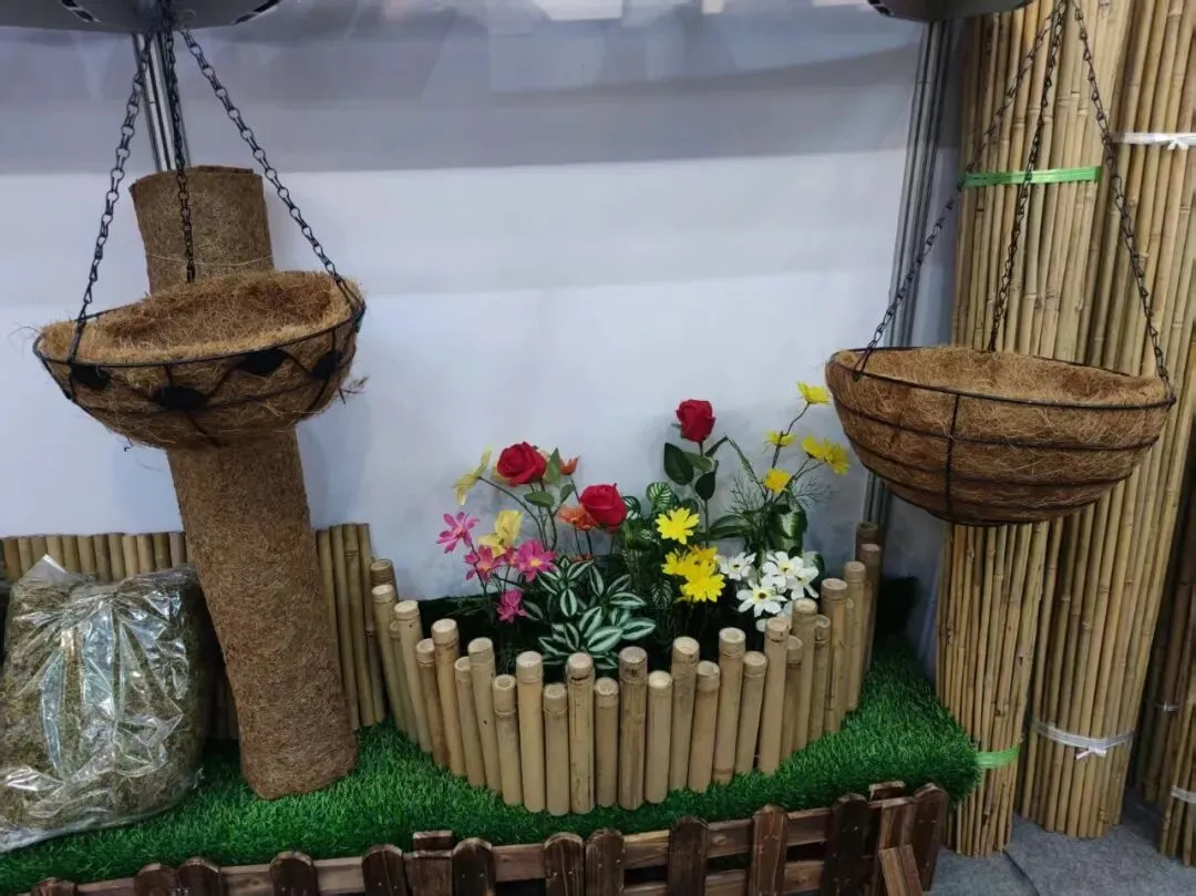 园林用品展区内,广宁县方圆竹业的竹花架、竹篱笆、椰棕花盆等产品整齐陈列,天然竹材的温润质感扑面而来,吸引了来自欧美等地的采购商。