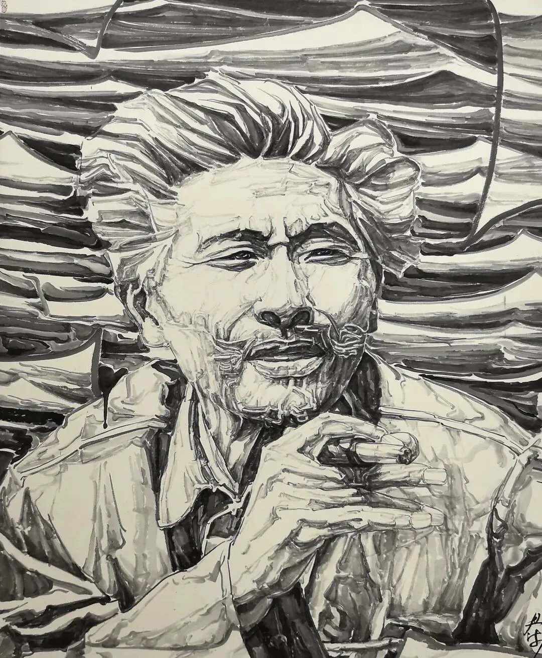 此作笔墨狂放,以酣畅淋漓的线条与墨块塑造人物,枯润交织间张力十足。创意上以写意水墨重构经典形象,借强烈的黑白节奏,传递出人物的精神风骨,极具时代气息与表现力。