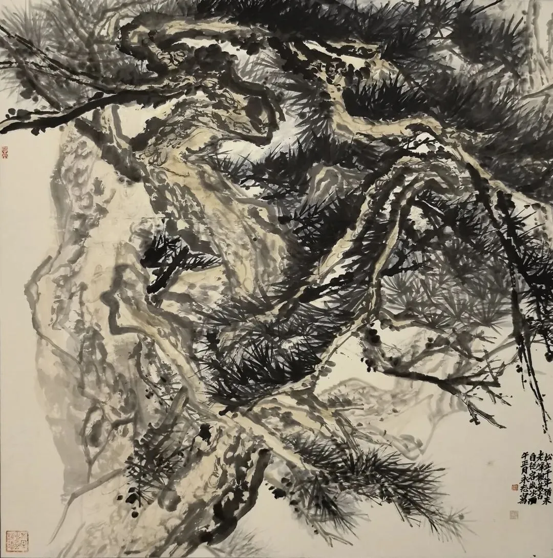 此作笔墨苍劲,以浓墨写松针如戟,枯笔皴擦老干,水墨淋漓间尽显苍劲风骨。创意聚焦古松虬枝,借传统写意笔法,以孤松之姿寄寓坚韧品格,气韵雄浑,意趣高古。