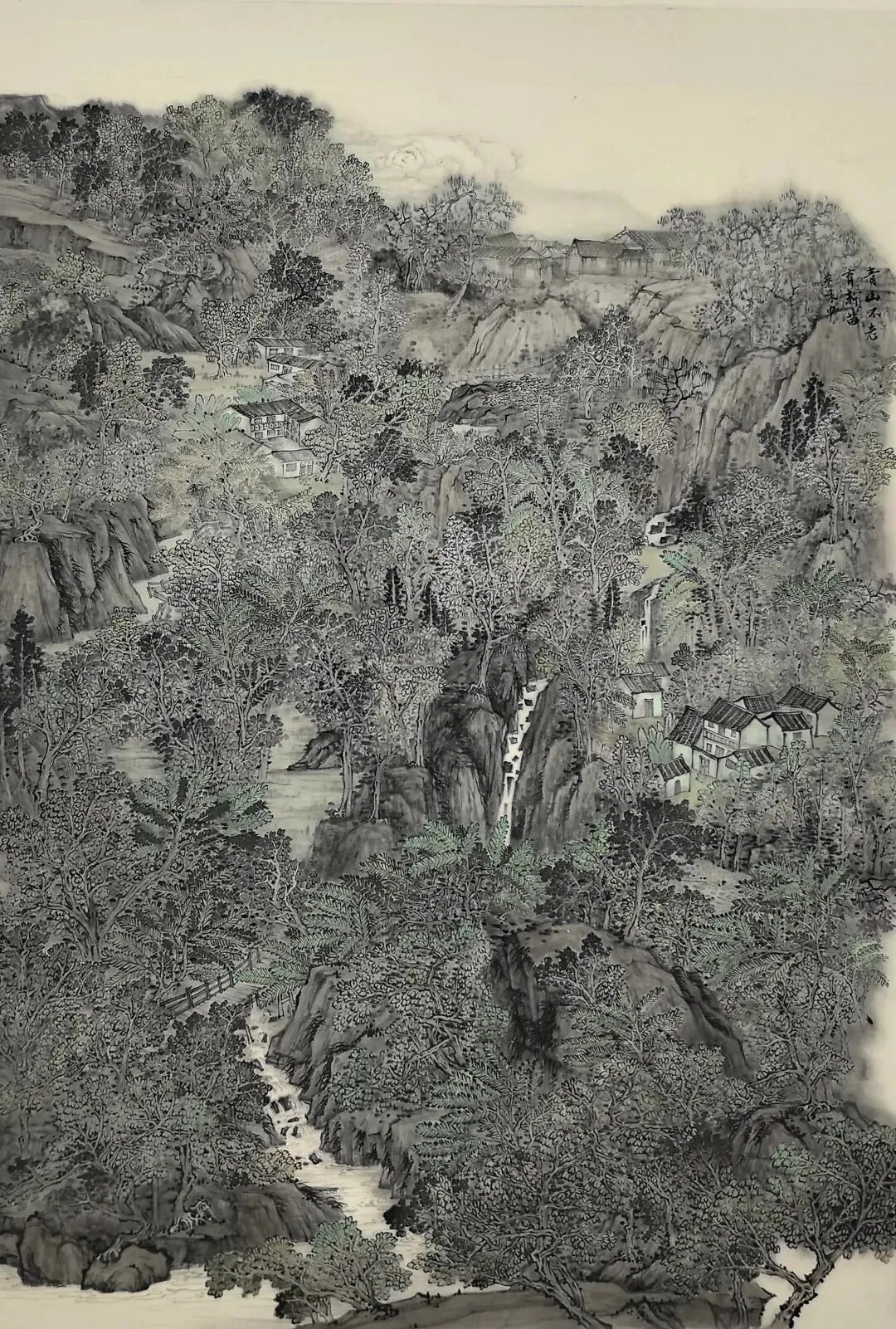 此作笔墨温润,以细密线条勾勒林泉,设色淡雅清润,层次丰茂。创意承继传统山水范式,将村舍溪涧融于幽境,营造出宁静悠远的田园意趣,尽显东方山水的清雅之美。