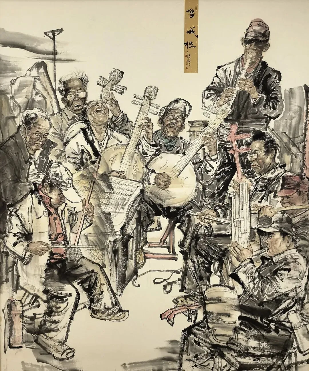 此作笔墨奔放,线条顿挫有力,墨色浓淡酣畅,精准捕捉人物动态与神情。创意聚焦市井乐者群像,以写意笔墨传递民间艺术的鲜活气息,于市井烟火中彰显乡土文化的生命力。