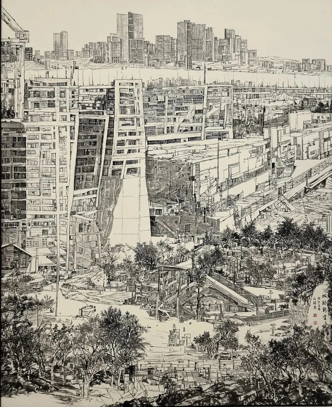 此作以白描线条勾勒城景,劲健精准,疏密有致,墨韵干净利落。创意上融传统界画与当代都市题材,以水墨重构城市肌理,在楼宇纵横间寄寓城市新生的时代意涵。