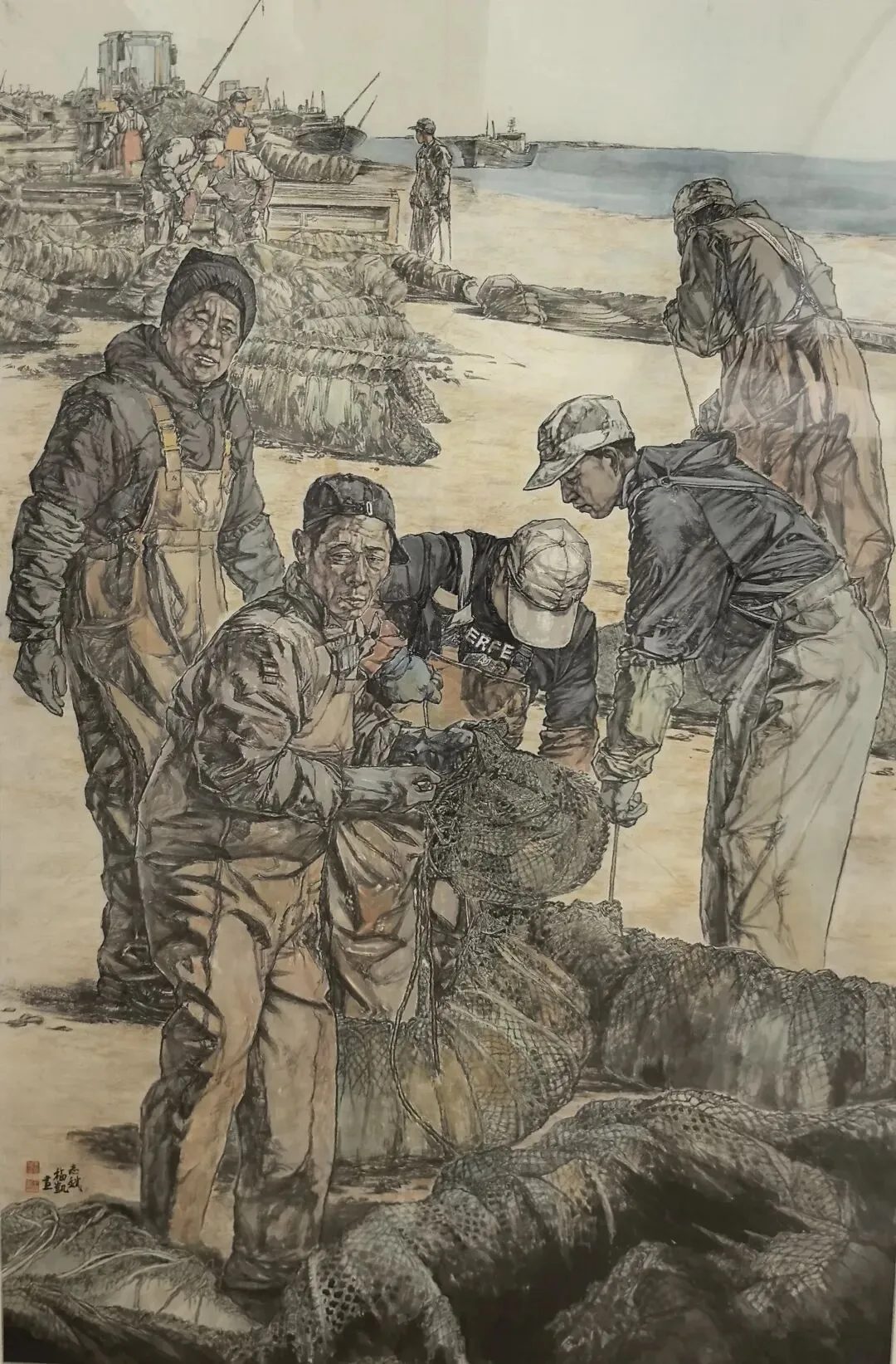 此作笔墨沉实,线条劲健苍润,以浓淡墨色与淡彩烘染,将渔民的粗粝质感刻画入微。创意聚焦渔港劳作场景,以写实笔墨定格平凡瞬间,以人文视角致敬劳动者,赋予传统人物画鲜活的时代温度。