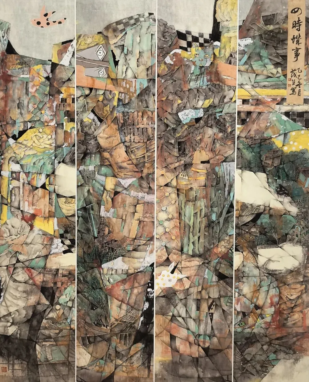此作笔墨以破碎线条与泼彩相融,枯润交织,墨色沉郁而彩韵跳脱。创意上以拼贴式解构重构城景,将市井符号嵌于碎片之中,传统笔墨承载当代都市的斑驳意象,极具张力。