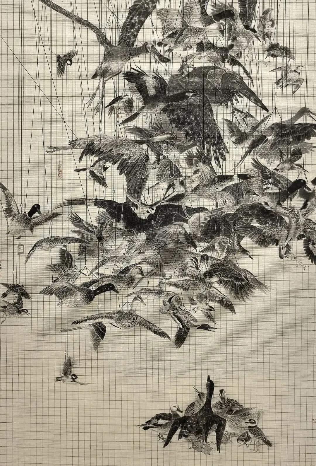 此作以工笔兼写意笔墨写群鸟,线条劲健,墨色层次丰富,晕染细腻。创意上以网格与悬线构建舞台,将飞鸟定格为被操控的标本,暗喻束缚,于传统翎毛题材中注入当代反思。