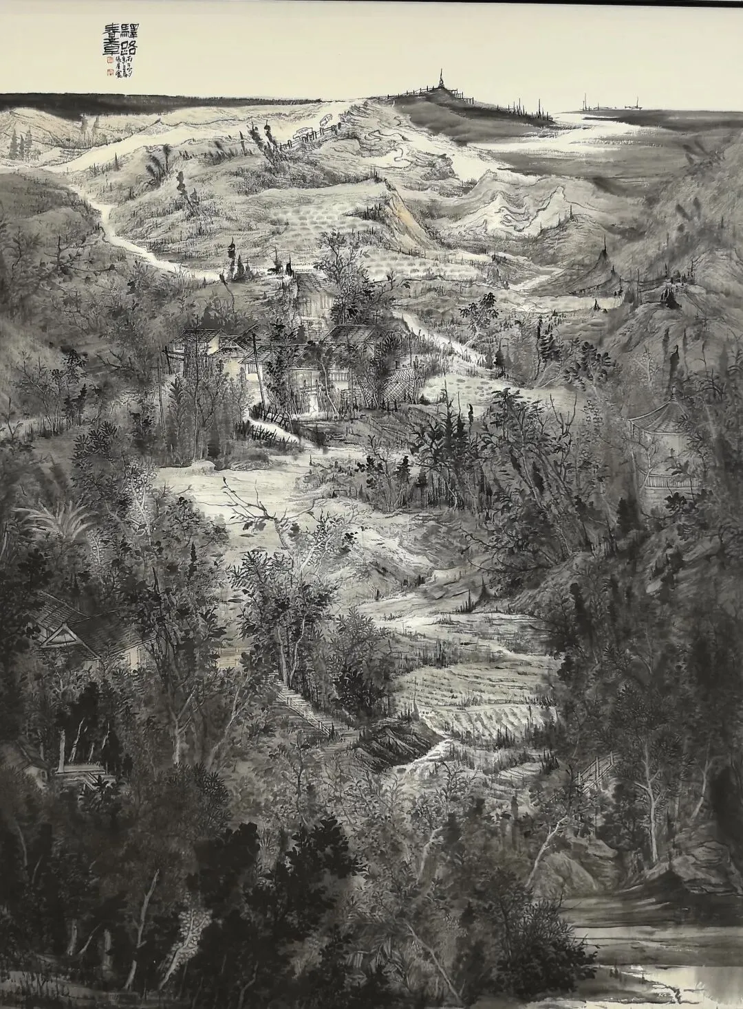 这幅《驿路春章》笔墨苍润,以浓淡墨色铺陈丘壑,线条勾勒屋舍林泉,枯润相生。创意上融古意与乡景,以传统山水语汇写当代驿路乡居,意境浑朴。
