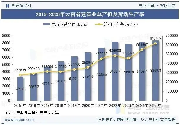 华经产业研究院数据显示:2025年云南省建筑业总产值为8369.27亿元,与2024年相比增加了229.85亿元,按总产值计算的劳动生产率为617928元/人,与2024年相比增加了66521元/人。