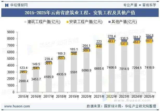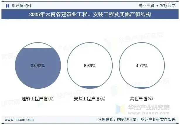2025年云南省建筑业总产值为8369.27亿元,其中:建筑工程、安装工程及其他产值分别为:7416.94亿元、557.53亿元、394.79亿元,分别与2024年同期相比:增加了122.41亿元、增加了103.81亿元、增加了3.62亿元,分别占云南省总产值的:88.62%、6.66%、4.72%。