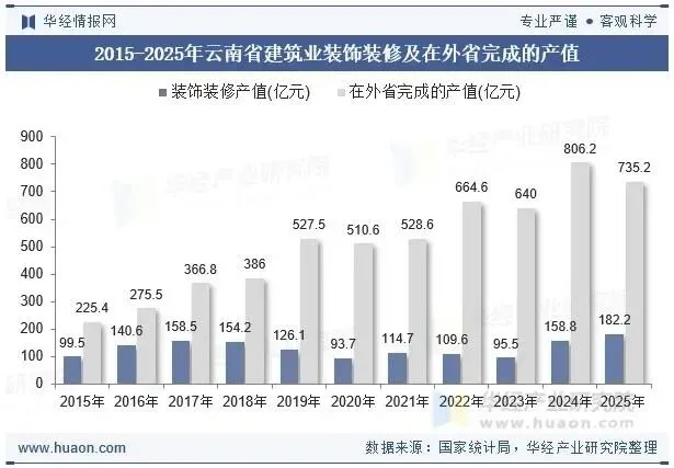 2025年云南省建筑业装饰装修产值为182.18亿元,与2024年相比增加了23.36亿元,在外省完成的产值为735.22亿元,与2024年相比减少了71亿元。