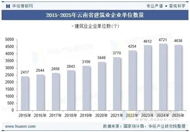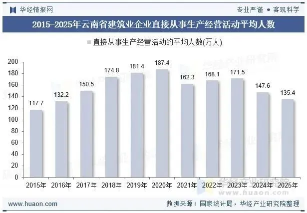 2025年云南省建筑业企业单位数量为4636个,与2024年相比减少了85个,从事经营平均人数为135.44万人,与2024年相比减少了12.17万人。