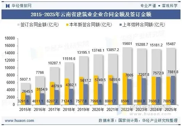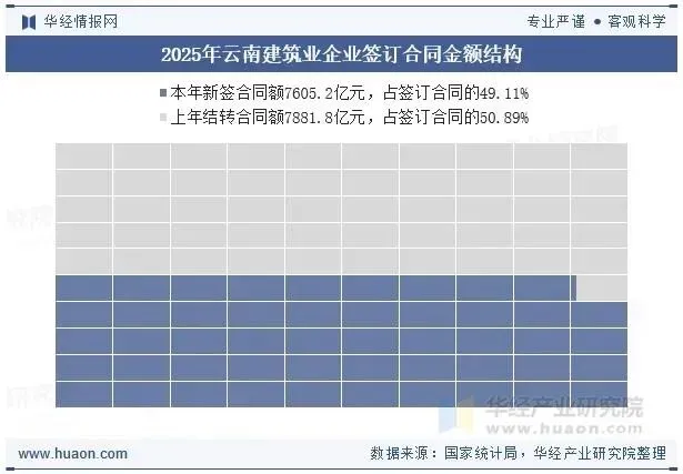 2025年云南省建筑业企业签订合同额为15486.98亿元,与2024年相比增加了305.81亿元,其中:上年转接合同额及本年新签合同额分别为:7881.78亿元、7605.2亿元,占云南省签订合同额的:50.89%、49.11%。