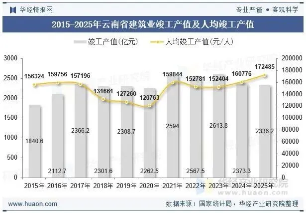 2025年云南省建筑业竣工产值为2336.15亿元,与2024年相比减少了37.1亿元,人均竣工产值为172485元/人,与2024年相比增加了11709元/人。