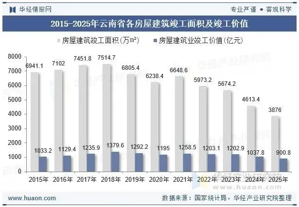 2025年云南省建筑业房屋建筑竣工面积为3876万平方米,与2024年相比减少了737.38万平方米,房屋建筑竣工价值为900.8亿元,与2024年相比减少了136.98亿元。