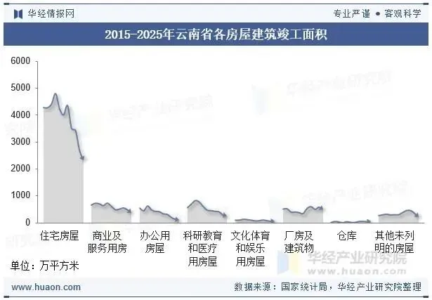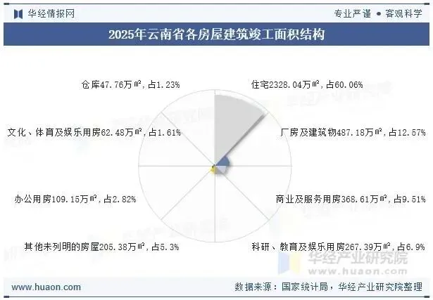 其中,2025年云南省住宅、厂房及建筑物、商业及服务用房、科研、教育及娱乐用房、其他未列明的房屋、办公用房、文化、体育及娱乐用房、仓库竣工面积分别为:2328.04万平方米、487.18万平方米、368.61万平方米、267.39万平方米、205.38万平方米、109.15万平方米、62.48万平方米、47.76万平方米,分别占云南省房屋建筑竣工面积的:60.06%、12.57%、9.51%、6.9%、5.3%、2.82%、1.61%、1.23%。
