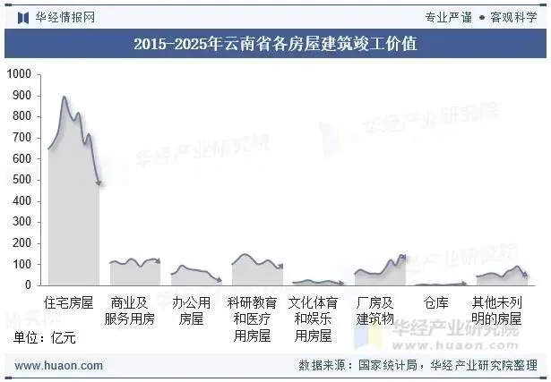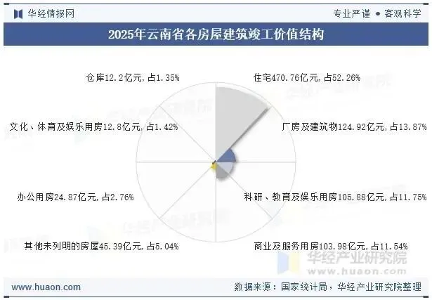 其中,2025年云南省住宅、厂房及建筑物、科研、教育及娱乐用房、商业及服务用房、其他未列明的房屋、办公用房、文化、体育及娱乐用房、仓库竣工价值分别为:470.76亿元、124.92亿元、105.88亿元、103.98亿元、45.39亿元、24.87亿元、12.8亿元、12.2亿元,分别占云南省房屋建筑竣工价值的:52.26%、13.87%、11.75%、11.54%、5.04%、2.76%、1.42%、1.35%。