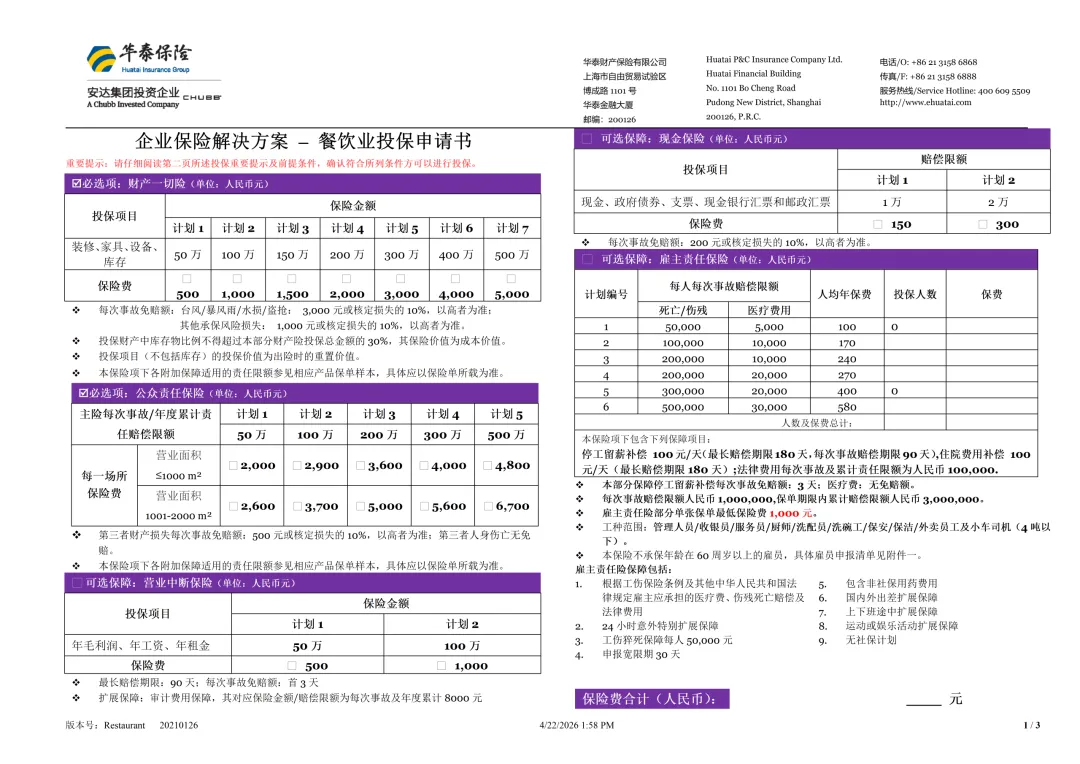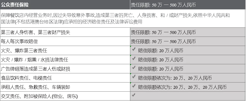 中餐、西餐、粥 / 面点、咖啡 / 茶、快餐、自助餐等各类餐厅。(餐饮业保险不适用于酒吧、夜总会、KTV、企业食堂、学校食堂、医疗机构食堂和内部餐厅、中央厨房和食品配送中心)