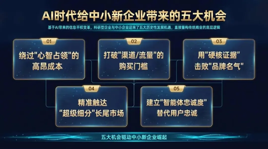 一是绕过“心智占领”高昂成本:无需广告轰炸,专注让AI精准“理解”产品核心价值。二是打破“渠道/流量”购买门槛:无需购买关键词或推荐位,凭借内容质量与匹配度获得AI自动化精准推荐。三是用“硬核证据”击败“品牌名气”:技术实力与可验证数据成为核心竞争力,可直接挑战大牌。四是精准触达“超级细分”长尾市场:利用AI聚合全球极度分散的个性化需求,将传统无法服务的“长尾”转化为有效市场。五是建立“智能体忠诚度”替代用户忠诚:产品成为AI解决特定问题的“标准答案”后,将获得智能体持续、稳定的被动推荐流量。