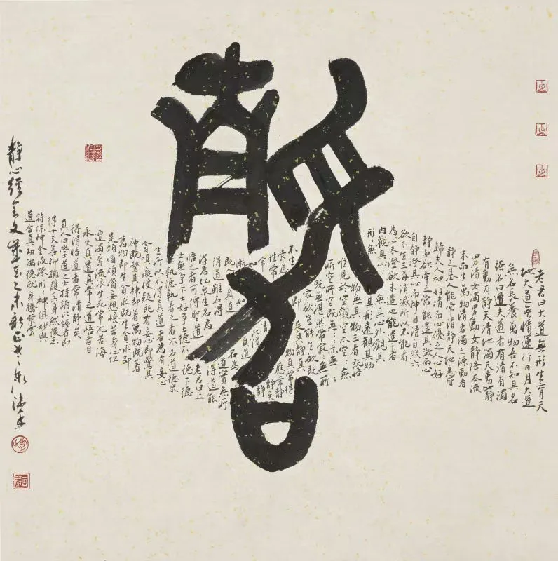 李金泰更是一位学者型艺术家,勇于在创作中触碰核心美学命题。在《楚简书屈原离骚》中,他自我设问并躬身实践:书法能否承载并表现浪漫主义的磅礴精神?他以“为历史留痕”为使命,不满足于《楚简书道德经》已取得的成就,决意在新作中与前者拉开距离,力求让观者透过笔墨,真切感受到屈原那激越澎湃的浪漫情怀。他援引英国文论家沃尔特·佩特“一切艺术都以趋向音乐的状态为旨归”的理念,将书法创作升华为视觉乐章:字句的疏密构成节奏的缓急,墨色的枯润比拟音色的明晦,通篇章法宛如一部宏大的交响叙事。这种跨艺术门类的美学融通,极大地拓展了书法的表现维度,为传统文化的当代转化提供了极具启发性的范本。数载苦心孤诣的探索,终使他成为将浪漫主义创作方法成功融入书法领域的先行者。