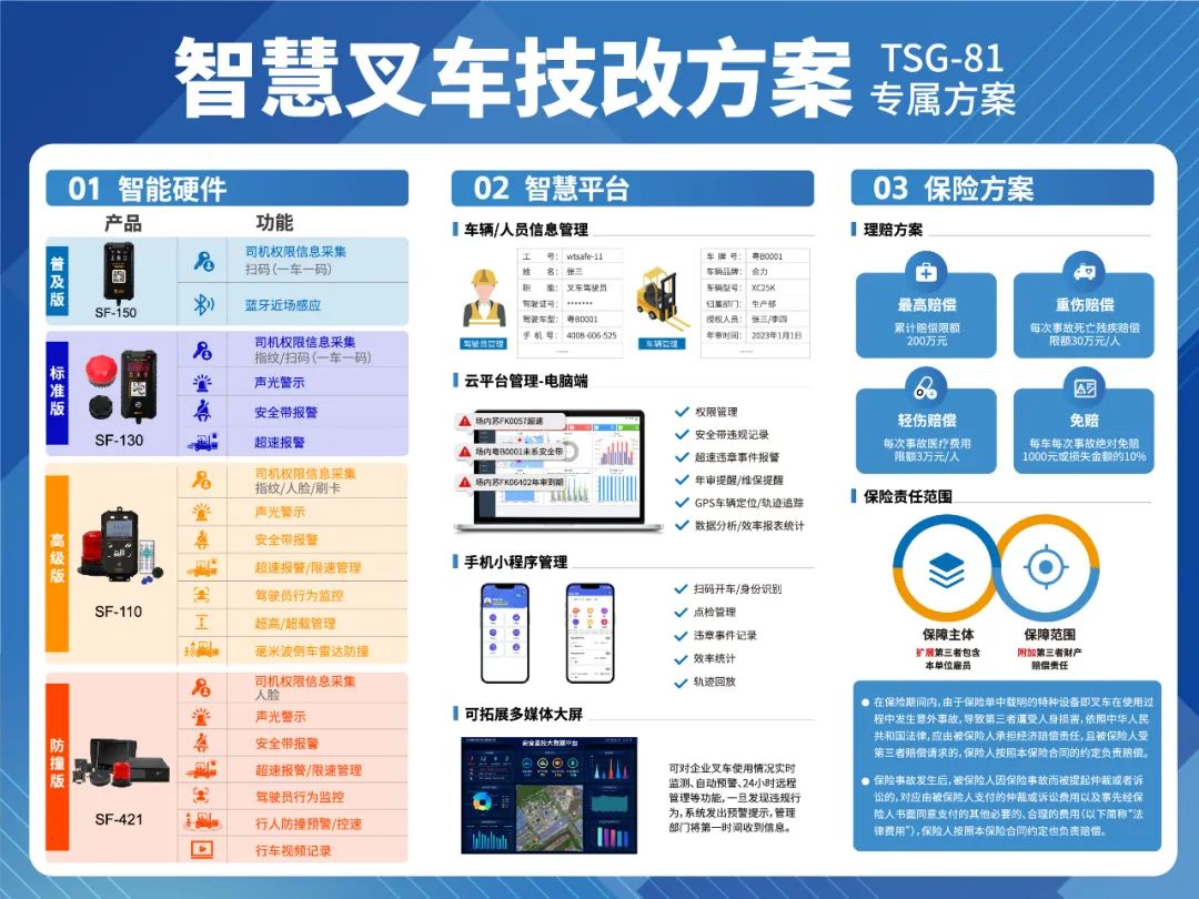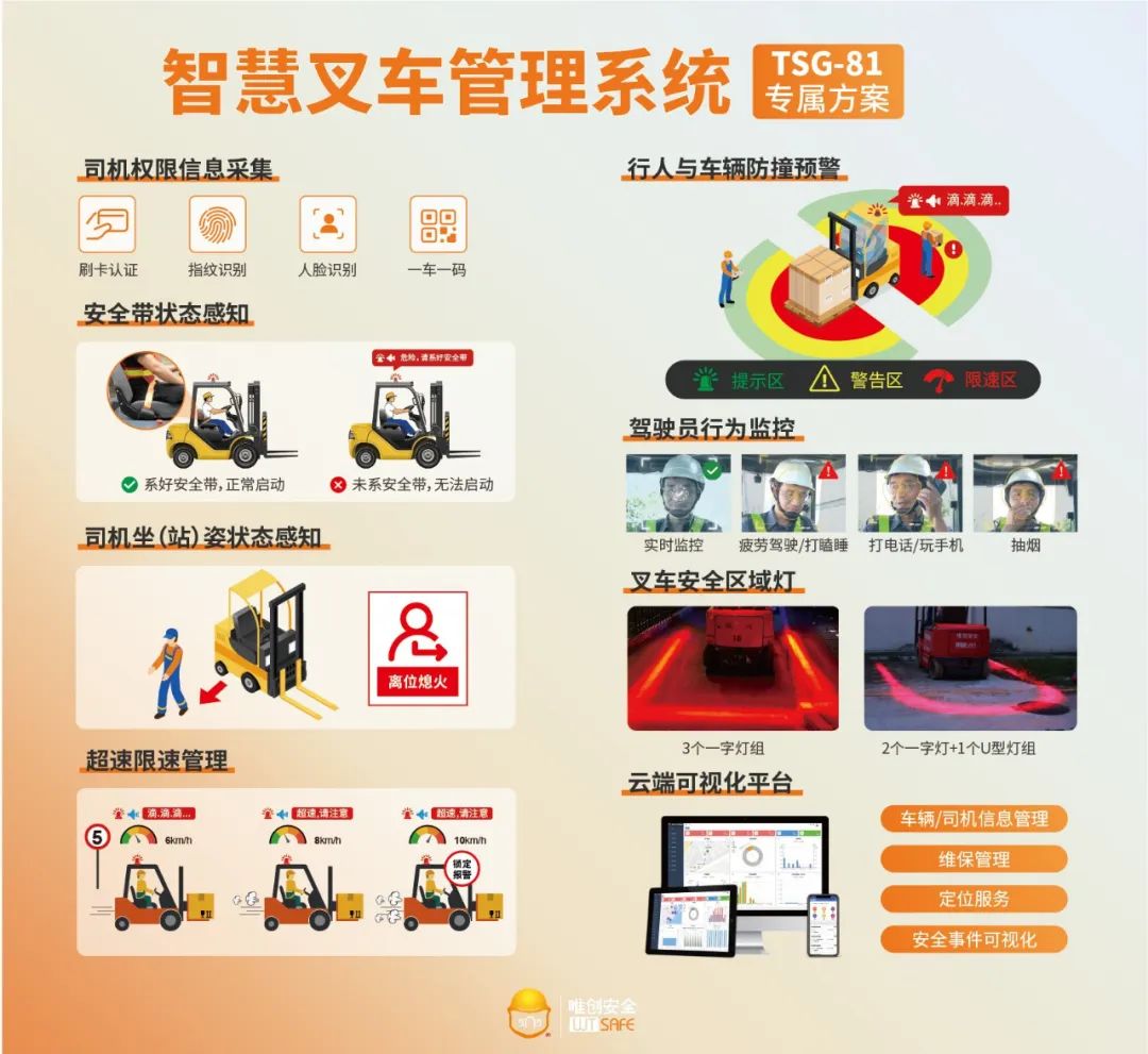 深圳唯创安全技术有限公司,聚焦于叉车安全管理、智能工厂等领域深耕二十多年,专注于为客户提供预防叉车安全风险的、提升叉车运作效率的数字化综合解决方案,是一家集研发、生产、销售、服务为一体的技术型企业。唯创安全智慧叉车管理系统,TSG81专属方案,包含司机权限信息采集器等叉车安全监控装置,要求司机通过人脸/刷卡/指纹/扫码等认证方式启动叉车,具备安全带状态感知、司机坐(站)姿状态感知功能,可拓展超速限速管理、司机行为监控、行人与车辆防撞预警等功能。唯创安全叉车安全监控装置系列产品,从SF-110拓展到了SF-150、SF-130、SF-421在内的智能硬件设备及智慧云平台,统筹保险方案于一体的智慧叉车技改整体解决方案,符合TSG81《场(厂)内专用机动车辆安全技术规程》,满足客户企业安全运营与政府相关部门全新安全监管需求。从普及版到标准版、高级版、防撞版都备齐了,该系列产品具备性价比高、适配性强、安装方便等优势,这些产品及解决方案都将亮相于本次展会。您想详细了解哪一款呢?来唯创安全直播间,与我们咨询吧~