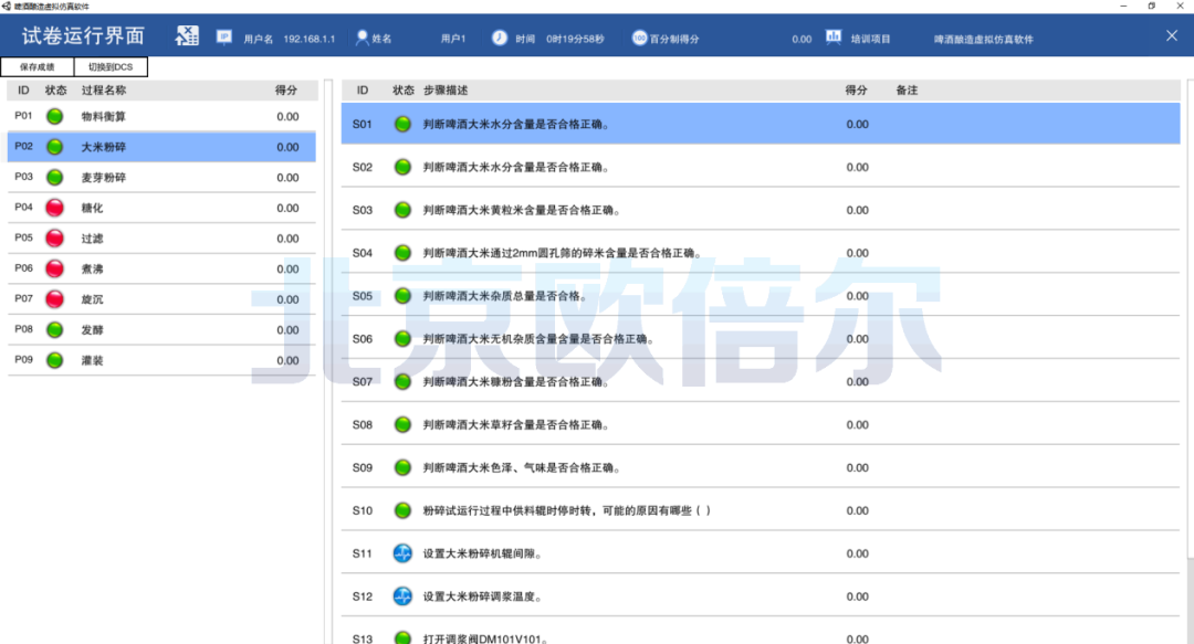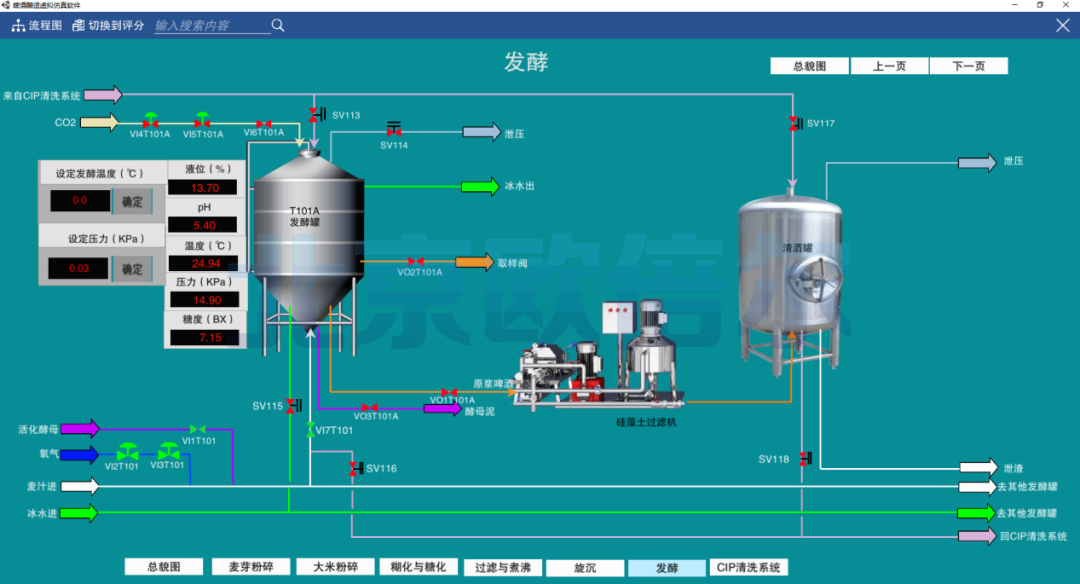 软件通过原料粉碎、糖化、过滤、煮沸、旋沉、发酵、灌装七个任务模块展开啤酒酿造过程。学生可依次选择任意一个任务模块进行操作,方便对重点工段反复学习和练习,提高了学习的精确性。