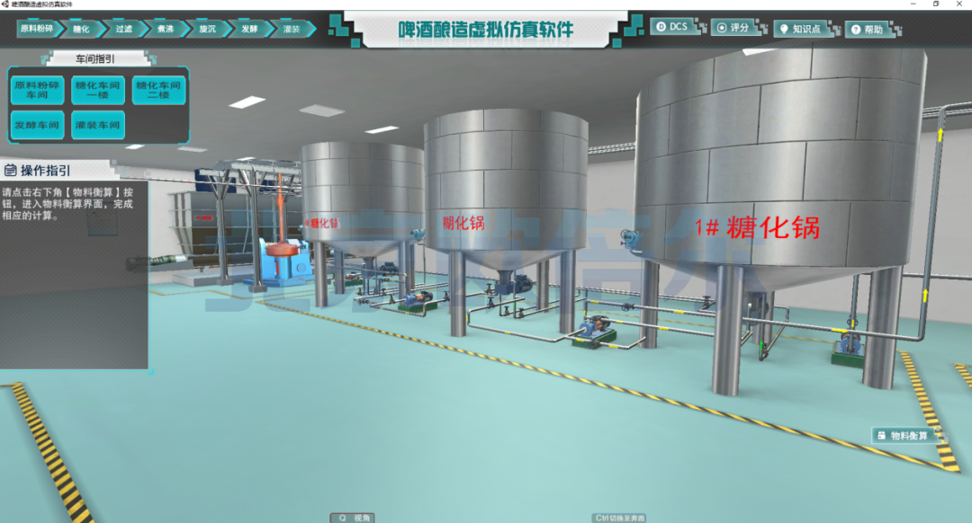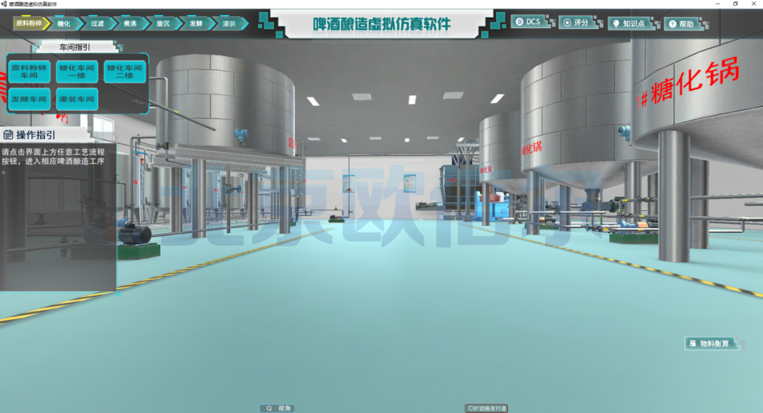 软件依据实际啤酒生产拍摄场景进行车间布局及模型搭建,按实际实验过程完成交互,完整再现了啤酒酿造的原料粉碎车间、糖化车间、发酵车间、灌装车间等。
