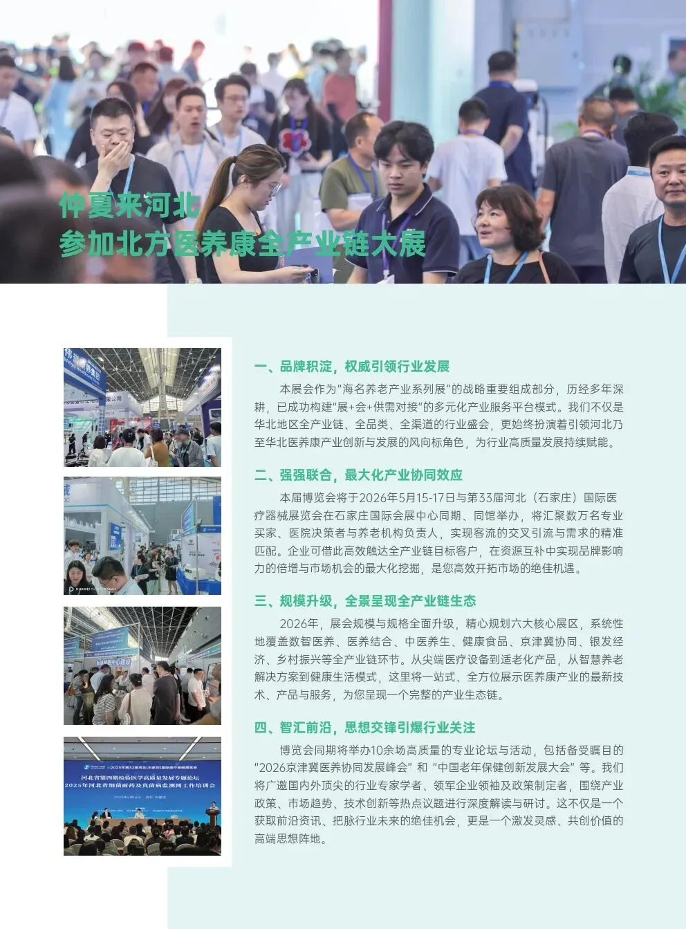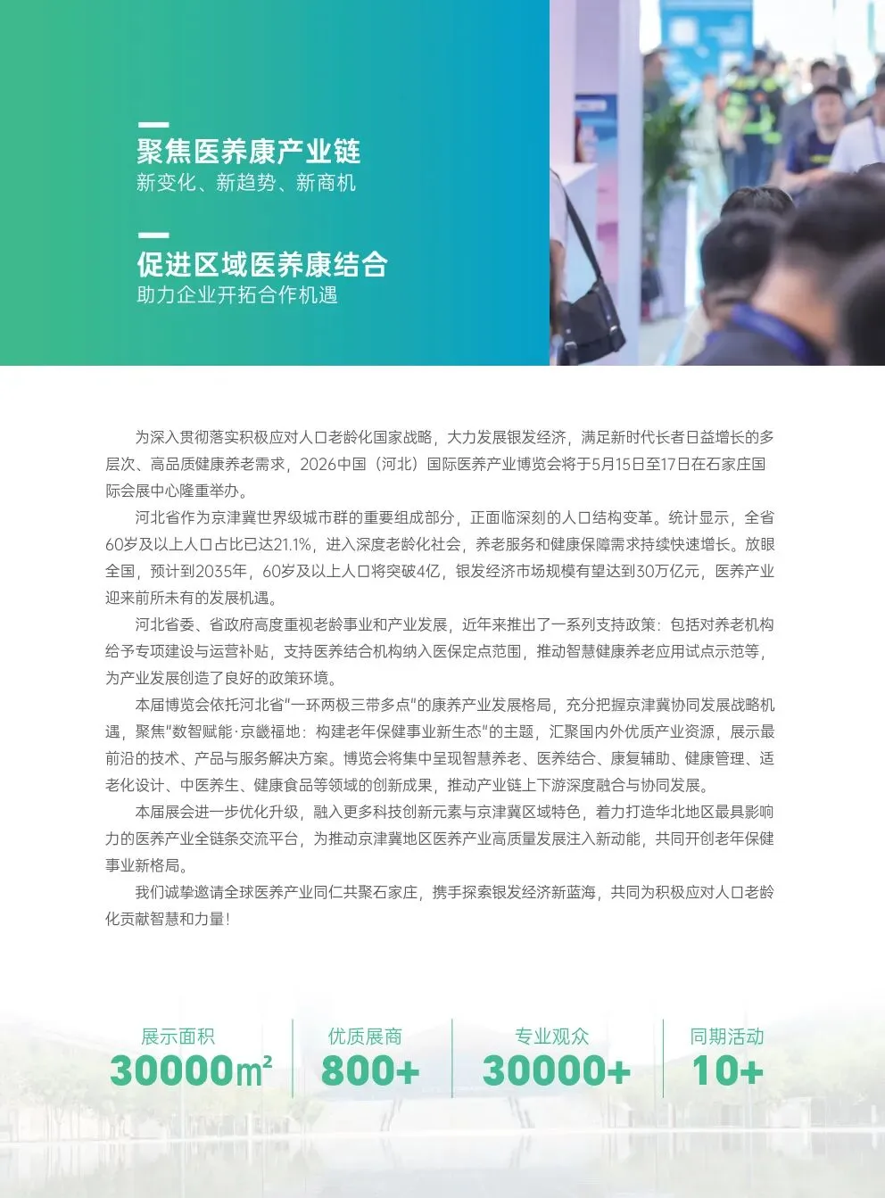 2026中国(河北)国际医养产业博览会将于2026年5月15至17日在石家庄国际会展中心举行,本届博览会与第33届河北(石家庄)国际医疗器械展览会同期举办,展览面积突破3万㎡,汇聚全国800+优质参展企业,30000+专业观众齐聚,国内外众多领先的医养康企业展示最新科研成果和产品,为观众提供了与行业领军企业直接交流的机会,进一步促进医养康产业结合发展。