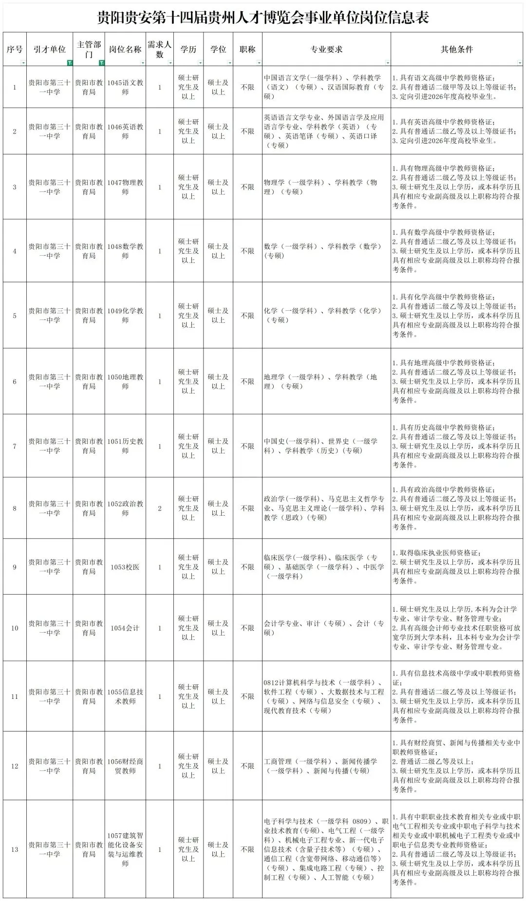 为大力实施人才兴市战略,按照相关工作安排,现将第十四届贵州人才博览会贵阳市第三十一中学(贵阳市经济贸易中等专业学校)引进高层次及急需紧缺人才有关事项进行公告。