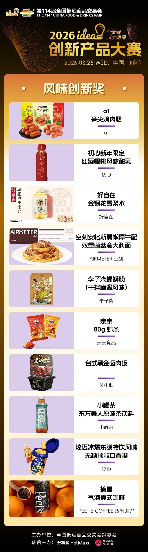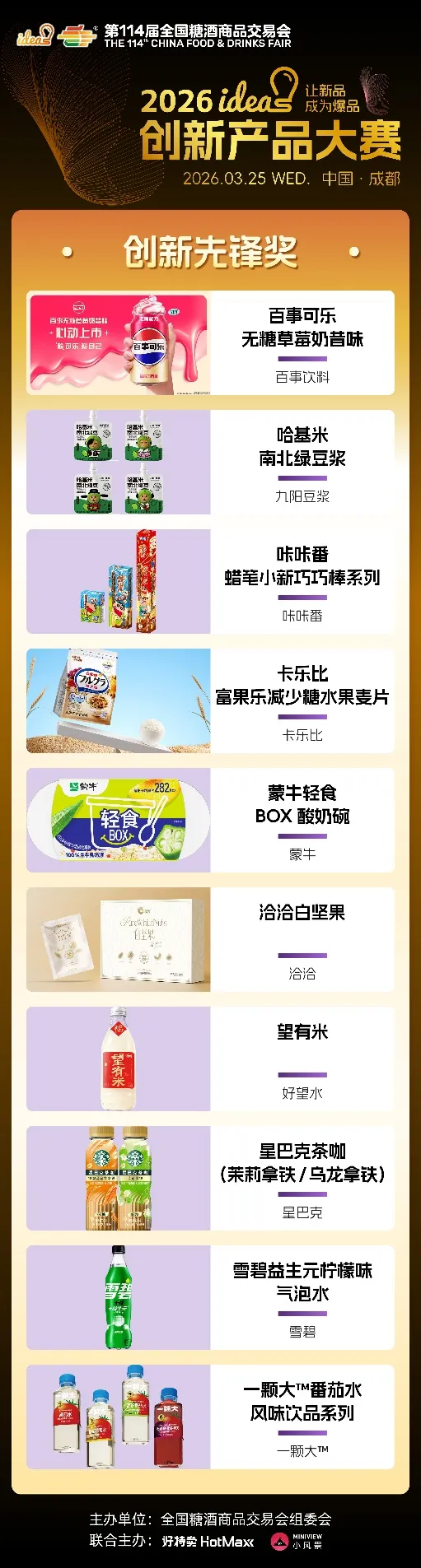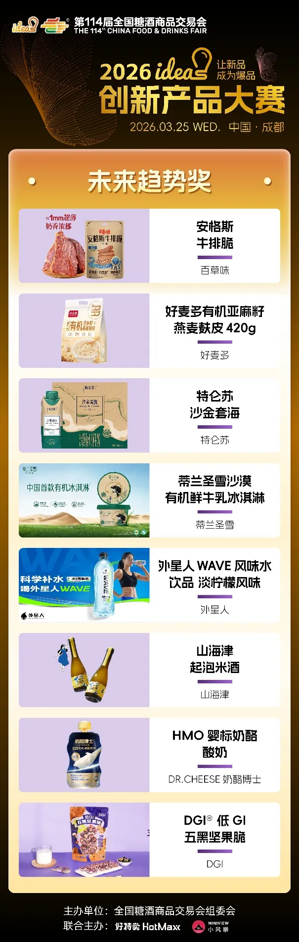 ideas创新产品大赛始终以“让新品成为爆品”为核心使命,不仅为优质新品提供高光舞台,更搭建品牌对接、资源互通、市场落地的高效桥梁。96款六大维度奖、五大特殊奖产品,既是创新成果的集中展现,更是未来消费趋势的提前剧透,它们以突破常规的创意、精益求精的品质,打破新品成长壁垒,助力小众创新走向大众爆款,为中国食饮产业注入源源不断的新生动能。