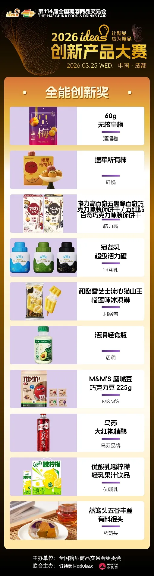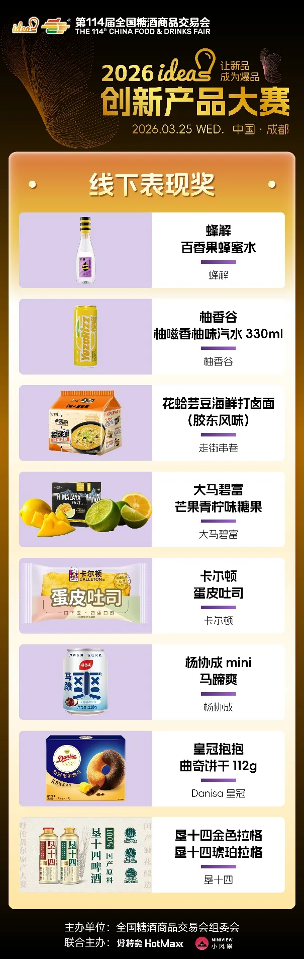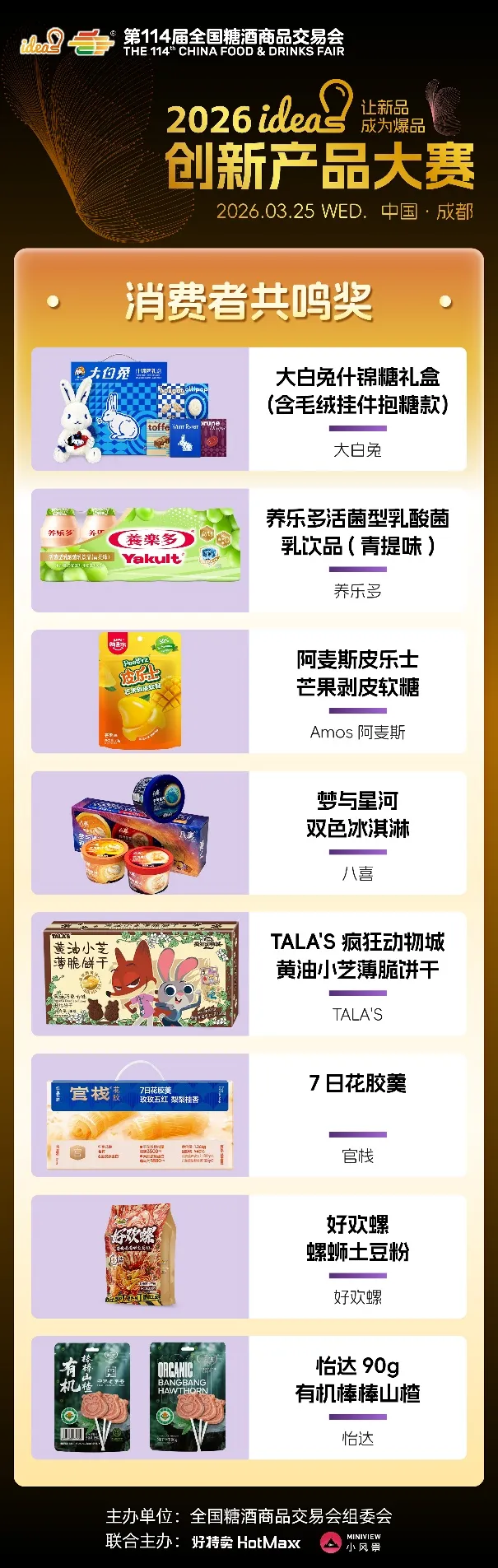 ideas创新产品大赛始终以“让新品成为爆品”为核心使命,不仅为优质新品提供高光舞台,更搭建品牌对接、资源互通、市场落地的高效桥梁。96款六大维度奖、五大特殊奖产品,既是创新成果的集中展现,更是未来消费趋势的提前剧透,它们以突破常规的创意、精益求精的品质,打破新品成长壁垒,助力小众创新走向大众爆款,为中国食饮产业注入源源不断的新生动能。