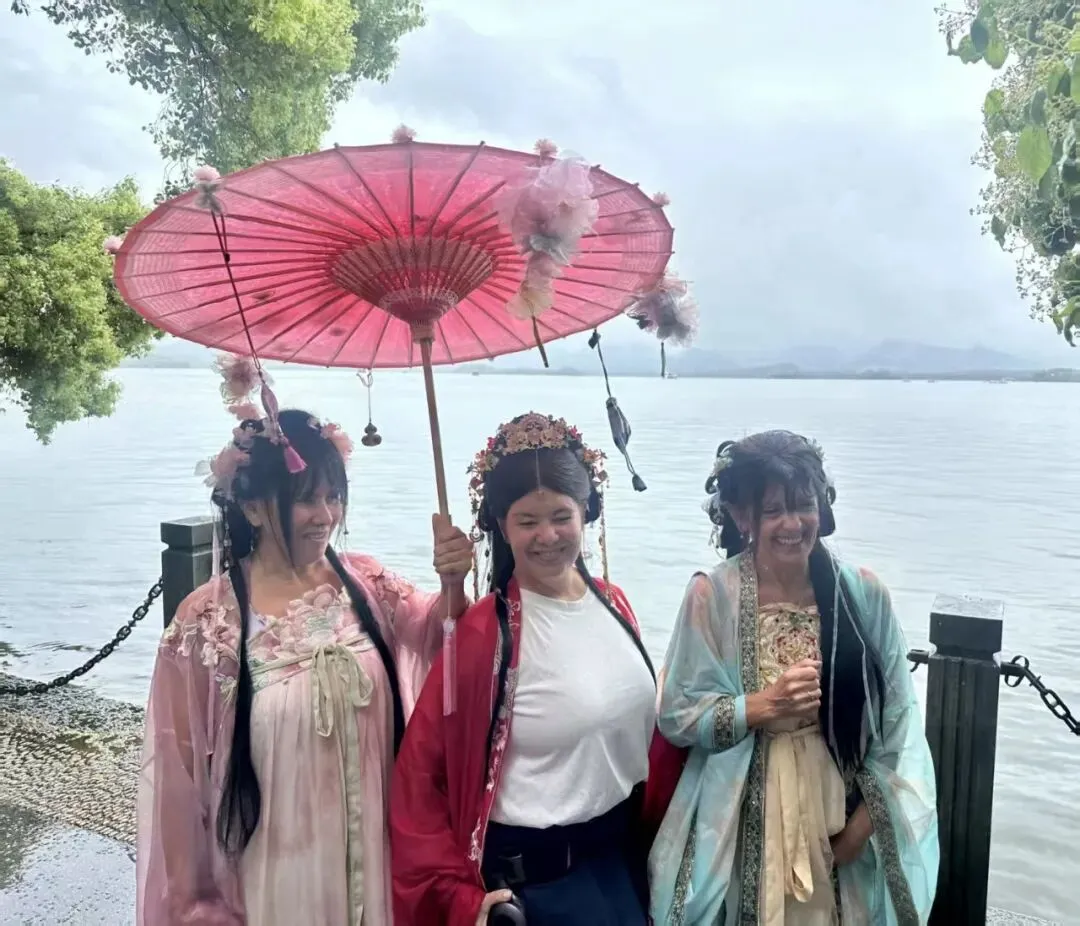 这份感动并未止步于广交会。昨天,Maria Laura女士的身影出现在了杭州西湖边。这一次,她不仅再次穿戴着那套意义非凡的杭产外骨骼机器人,还换上了一身精致的汉服,盘起了发髻。“汉服是中国文化的特色,来到杭州西湖,非常想体验一下汉服妆造,感受中国的传统文化。”Maria Laura笑着说。陪同她来的,正是此前在广交会上的同伴Patricia。