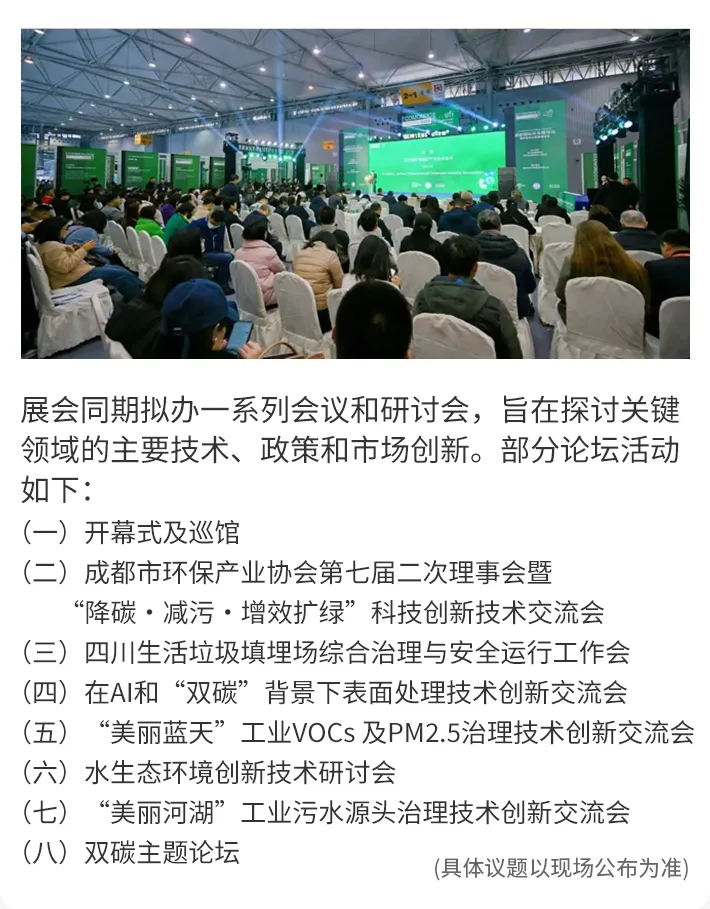 成都国际环保博览会立足成都、辐射西部,以“水、大气、固废、资源综合利用、环境监测、新能源”六大核心领域为主题,聚焦前沿技术与创新产品,搭建参展企业与专业观众高效对接的桥梁。