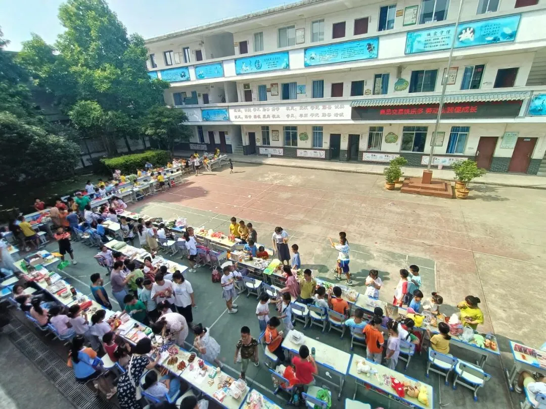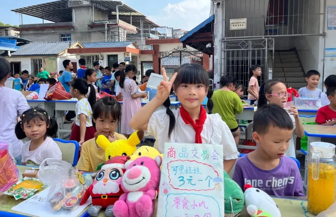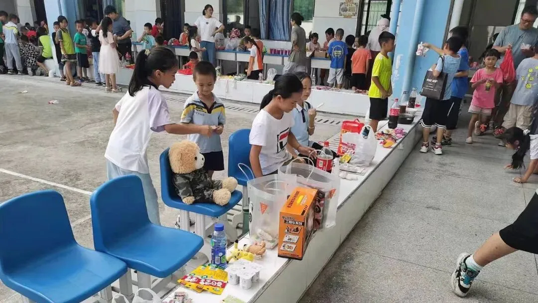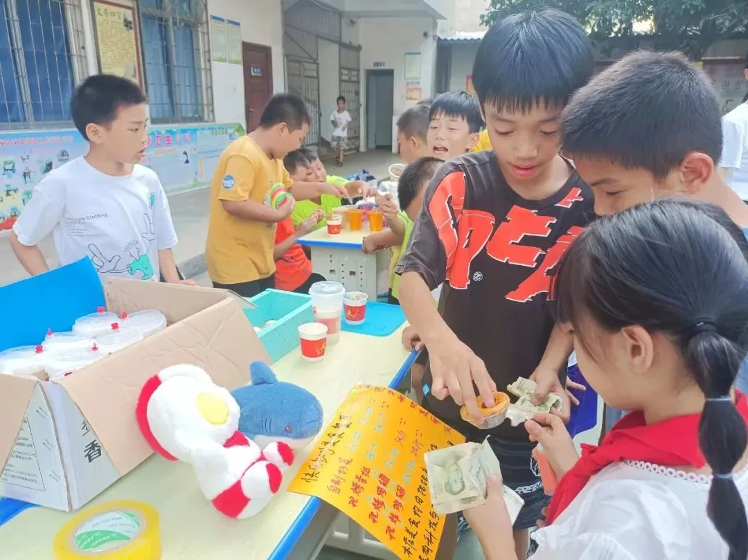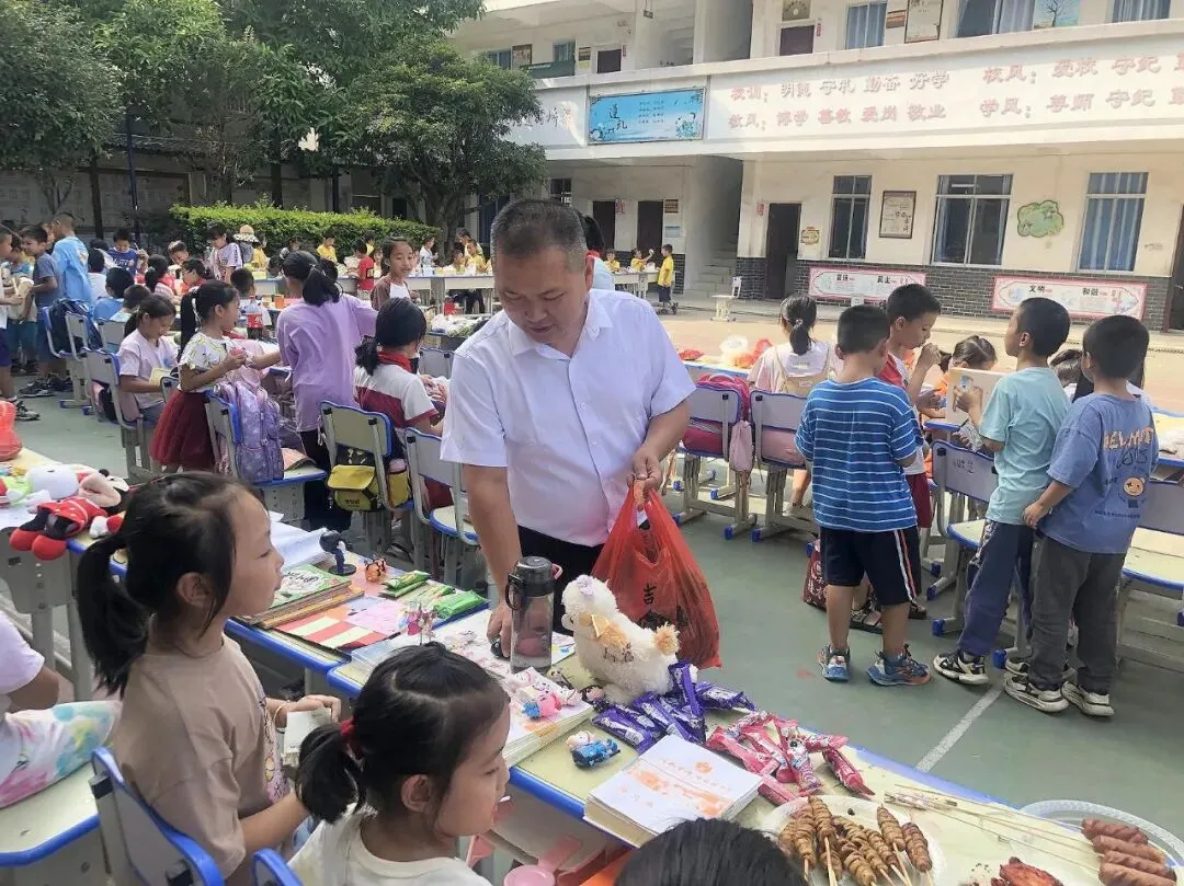 14时30分,商品交易会正式开始。各个摊位上的商品琳琅满目,摆放着孩子们带来的各式各样的物品:手工凉粉、奶茶、小零食、趣味抽奖、娃娃、蛋挞……孩子们“变身”为名副其实的“小摊主”,做起生意来有模有样。大家各出奇招:有的学生卖力吆喝——“看一看、瞧一瞧啦,走过路过不要错过”;有的制作了吸引眼球的商品小招牌;还有的向来来往往的“顾客”发放自己精心制作的宣传单,用花样百出的促销方式吸引“顾客”前来购买。欢笑声、叫卖声、讨价还价声不绝于耳,学校操场俨然成了一个热闹的交易市场。