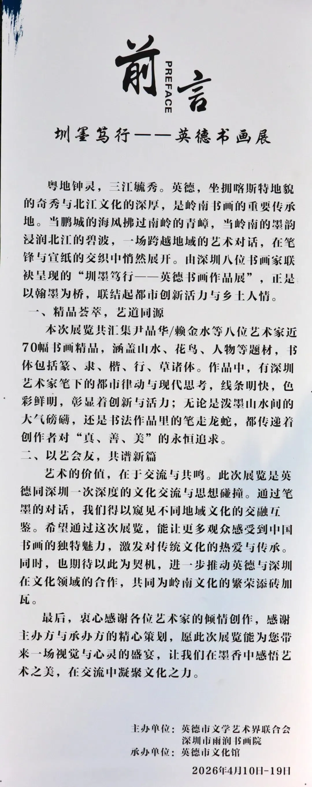 由深圳市文化广电旅游体育局、清远市文学艺术界联合会指导,英德市文学艺术界联合会、深圳市雨润书画院主办,英德市文化馆承办,书法天下网媒体支持的"圳墨笃行·艺助英德百千万"深圳八友书画作品展在英德市文化馆展出。