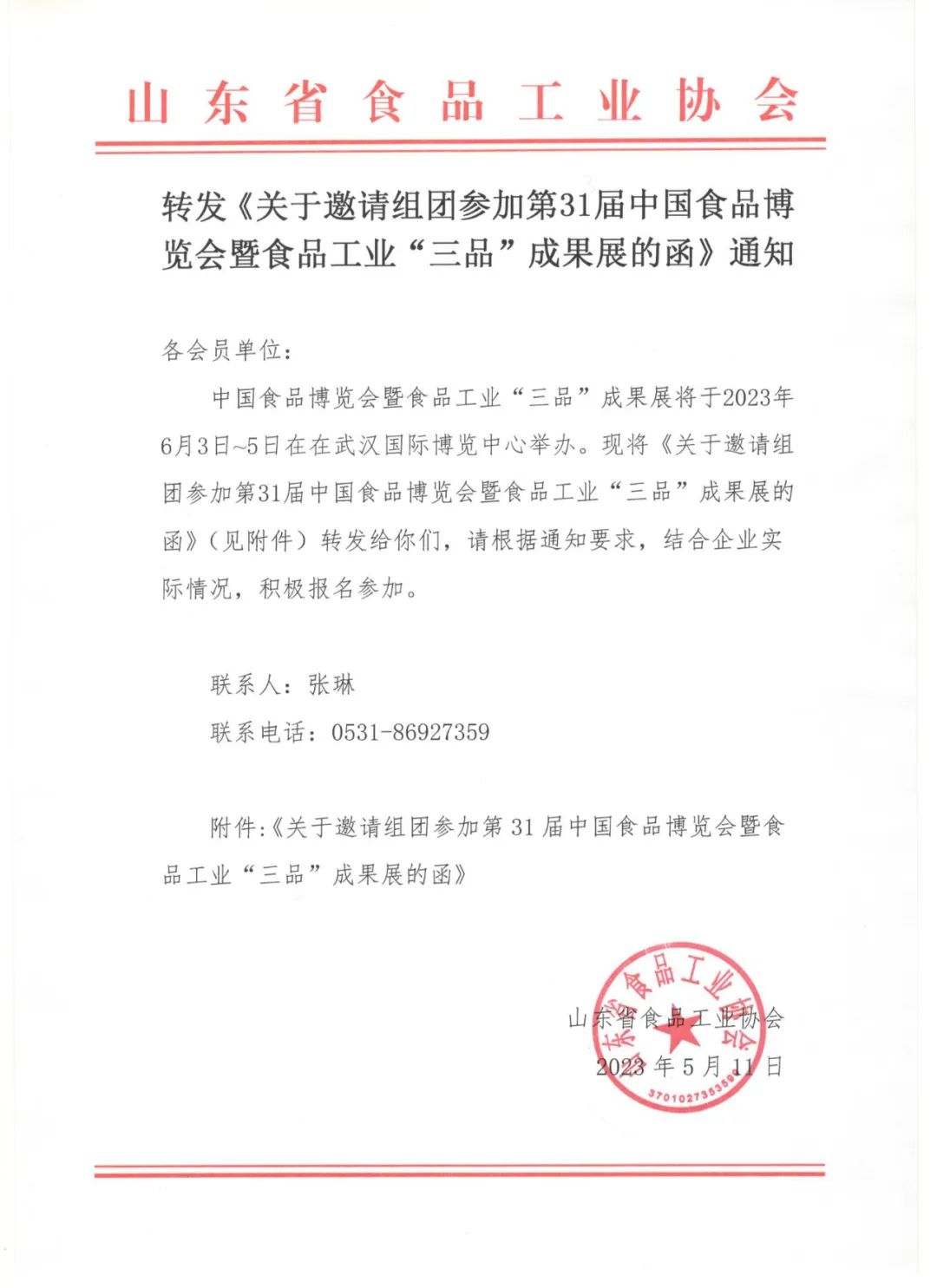 转发《关于邀请组团参加第31届中国食品博览会暨食品工业“三品”成果展的函》通知