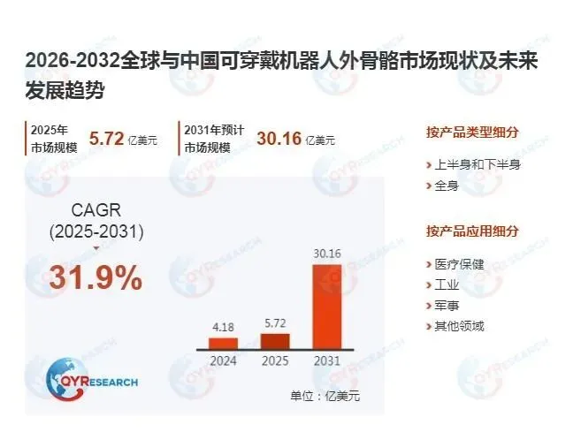 产业发展方面,据中研普华产业研究院预测,全球外骨骼机器人市场将保持高速增长态势。技术突破释放成本红利,AI算法优化、材料科学进步推动核心部件成本下降,使得消费级产品价格持续下探,加速市场普及。据Business Research Insights数据,全球外骨骼可穿戴机器人市场预计到2026年将达到344.2亿美元,到2035年有望增至约3450.2亿美元,2026年至2035年复合年增长率达31.9%。