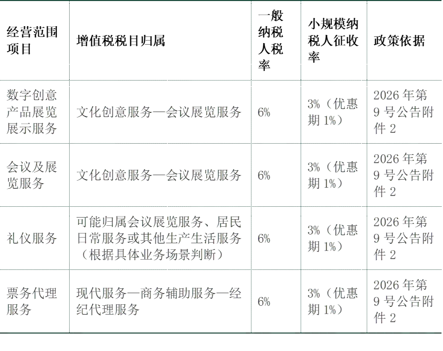 数字创意产品展览展示服务 | 文化创意服务—会议展览服务 | 6% | 3%(优惠期1%) | 2026年第9号公告附件2 |