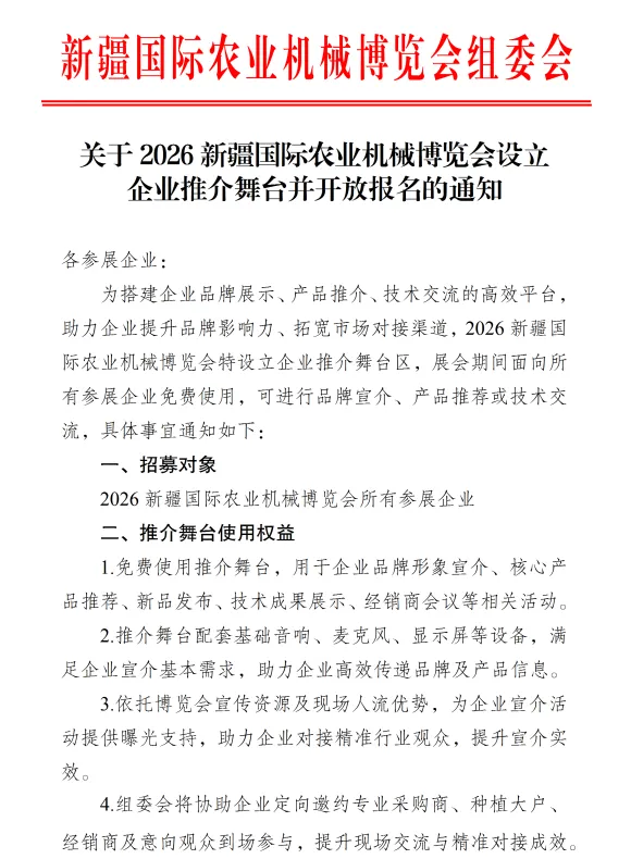 为进一步丰富展会内容,赋能参展企业品牌曝光,2026新疆国际农业机械博览会企业舞台推介区正式开放免费招募!