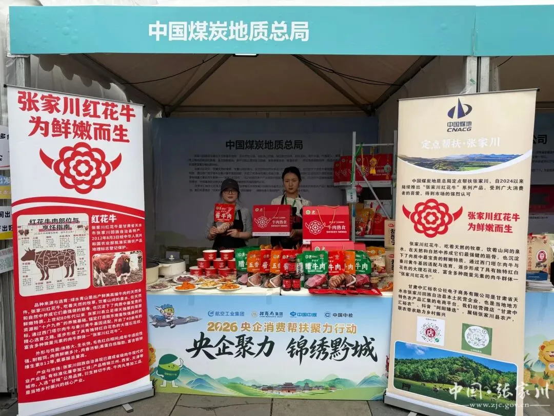 为深入贯彻落实党中央关于巩固拓展脱贫攻坚成果、全面推进乡村振兴的决策部署,深化央企消费帮扶协作,4月22日,“央企聚力 锦绣黔城”2026年央企消费帮扶聚力行动展销会在贵州安顺举办,40余家单位参展,扎实推进消费帮扶工作。中国煤炭地质总局定点帮扶的张家川县,携张家川红花牛系列特色农产品精彩参展。