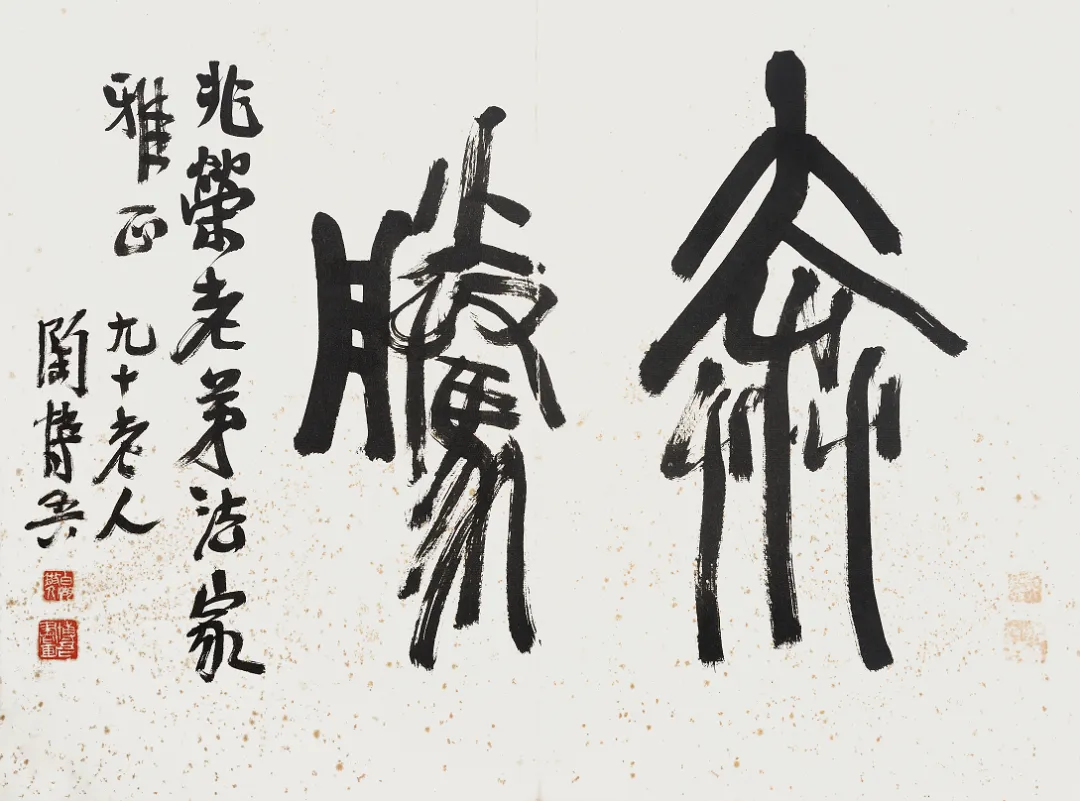石鼓文、散氏盘铭文写得好,就功力来讲达到了吴昌硕水平,就夸张变形、生动趣味方面看,超过了吴昌硕。