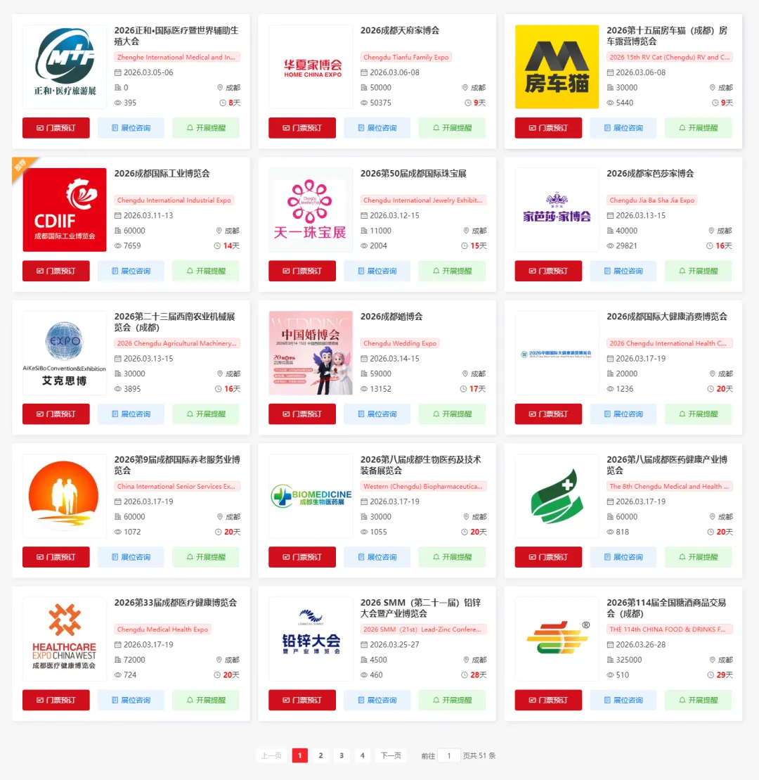 2026年5月成都将举办多场重要的展会活动,涵盖了家博会、教育、跨境电商、畜牧、环保、电动车、电力、家具、农业、食品、火锅、低空经济、应急管理、礼品、餐饮、清洁用品、能源、健康、电子、电线电缆展等多个领域。小编为大家整理了5月成都展会排期表,希望能帮助你规划行程。文中获取成都展会门票/展位预约入口~(大多门票限时免费)