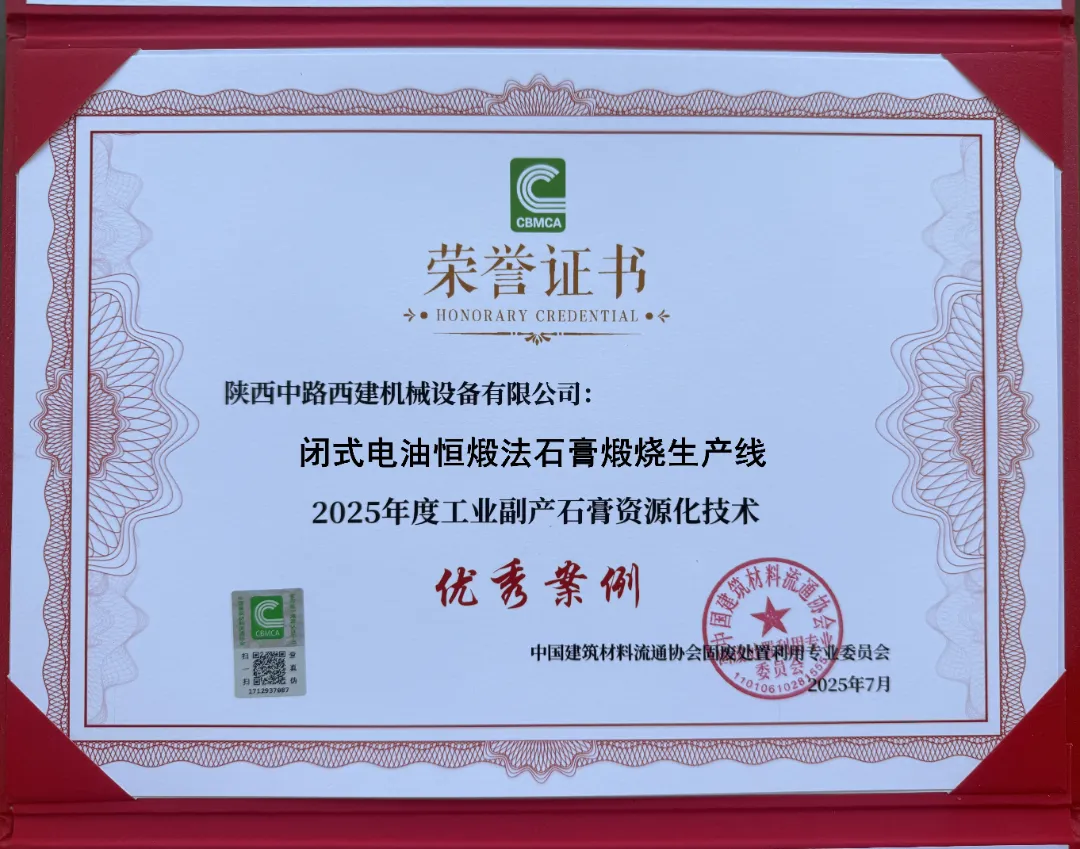 我们将不断拓展市场,为更多客户提供凝结时间恒定、烘干能耗降低40%以上、2H抗折强度4.0MPa以上(需原料品位92%以上)的石膏煅烧解决方案及装备,共同打造绿色、可持续发展的未来。同时,公司的煤基固废胶凝材料智能生产线也荣获“2024-2025年度煤基固废资源化技术优秀案例”,展现了公司在固废资源化利用方面的领先地位。