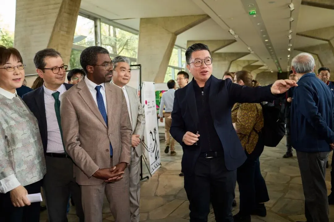 当地时间4月16日,“汉字智慧:中国汉字文化设计传播展”在位于巴黎的联合国教科文组织总部(UNESCO)启幕。联合国教科文组织大会主席塔尔哈(Khondker M. Talha)、联合国教科文组织执行局主席辛扎布(Nasser Bin Hamad Al Hinzab)、联合国教科文组织世界遗产中心主任拉扎赫·伊伦都·阿索莫(Lazare Eloundou Assomo)、中国常驻联合国教科文组织大使衔代表杨新育、中国常驻联合国教科文组织副代表王盈,以及法国汉学家、欧洲汉语教学协会名誉会长白乐桑(Joël Bellassen),展览艺术家、清华大学美术学院教授陈楠等300余名各国常驻代表、外交官及文化界人士等出席了开幕式。
