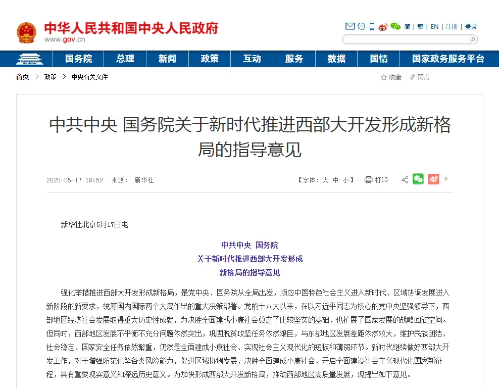5月17日,中共中央 国务院《关于新时代推进西部大开发形成新格局的指导意见》发布。