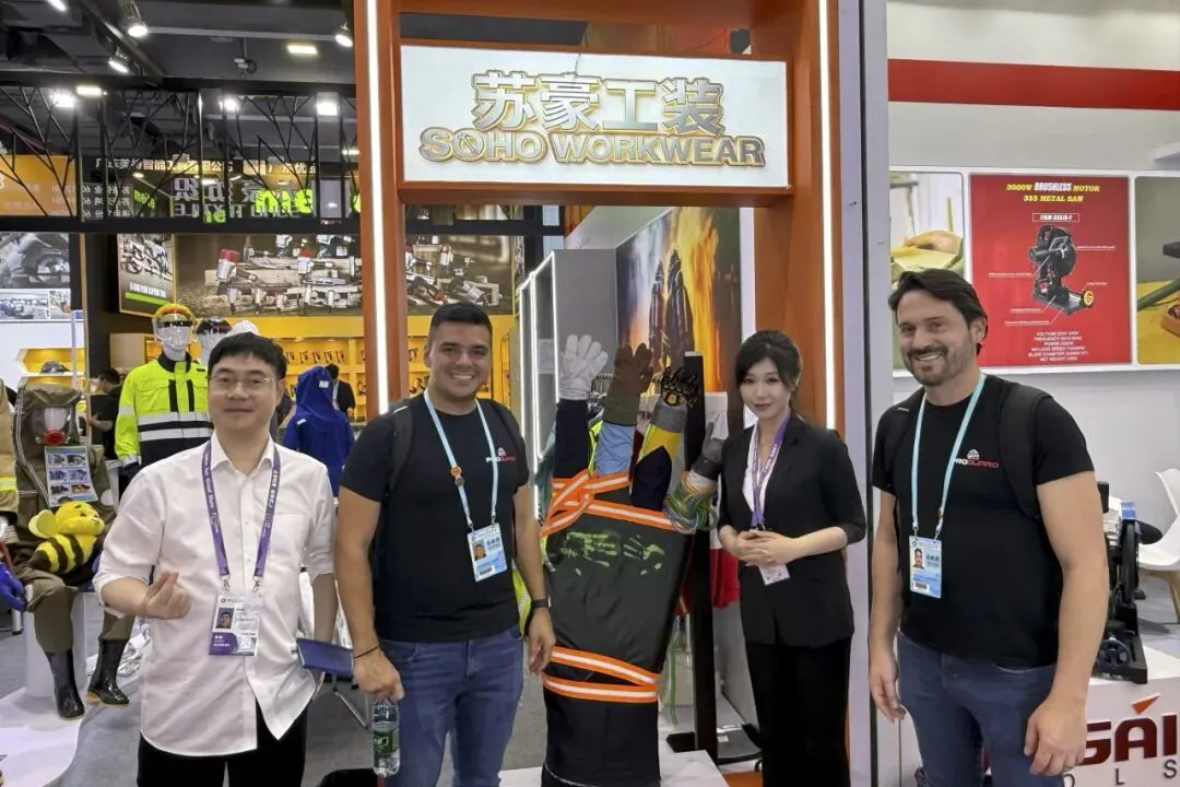 苏豪纺织在展会上推出全新品牌“苏豪工装SOHO WORKWEAR”,首次亮相工具展区。展前,苏豪纺织精心搭建“线上广交会”——苏豪工装独立站,完成300余件产品及180余块功能性面料信息的标准化上传,一站式呈现“面料到成衣”的全链条解决方案能力,为客商提供便捷高效的选品体验。为增强客商认可度,展区现场还创新增设功能性实物演示,让防护性能“看得见、摸得着”。