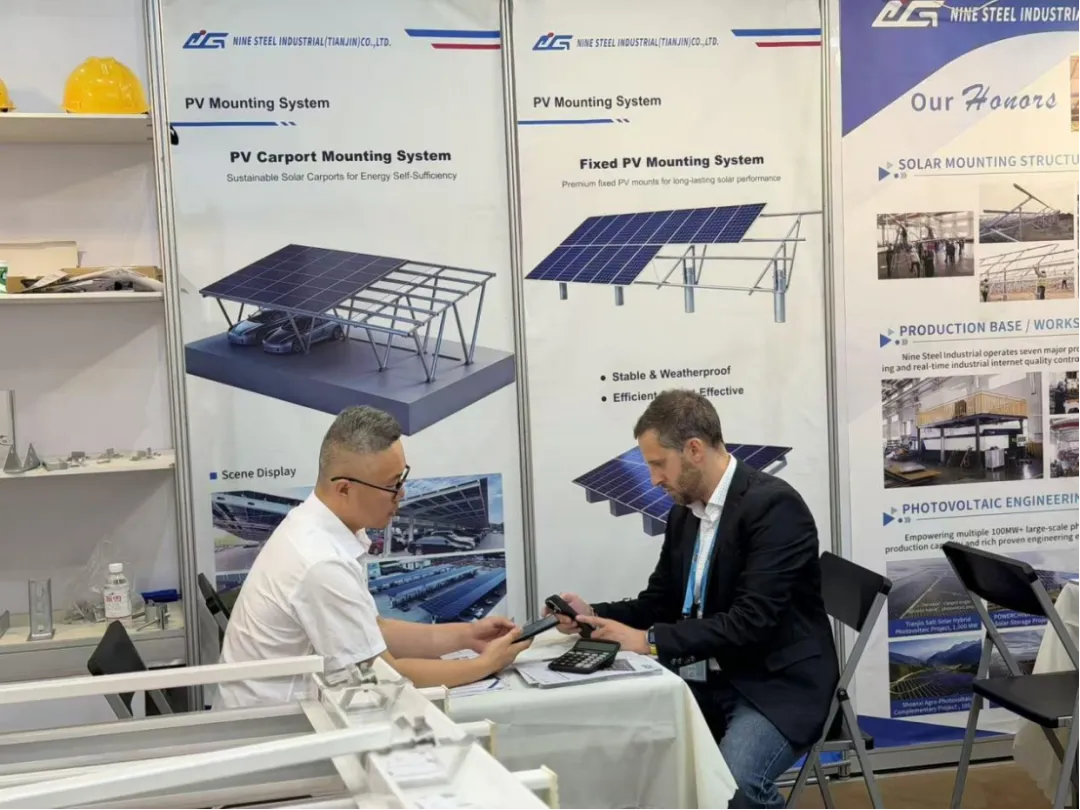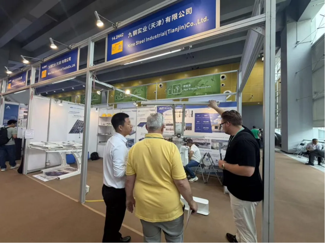 国际客商云集,贸易商机涌动。天津市瑞丰达金属制品有限公司(以下简称“瑞丰达”)、九钢实业(天津)有限公司(以下简称“九钢实业”)携手亮相展会一期,携旗下全系列光伏支架产品及新品登场,凭借硬核产品实力、本土产业优势、规模化生产能力,收获颇丰。