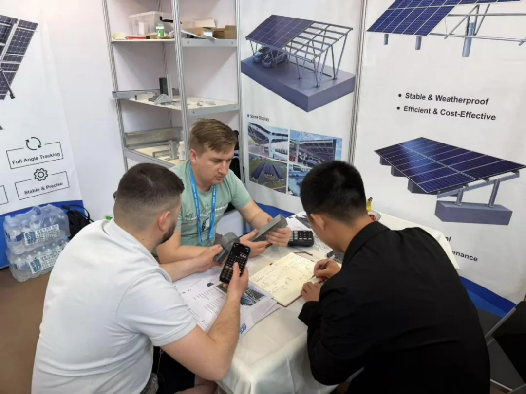 展会现场,瑞丰达不仅带来地面固定式光伏支架、屋顶支架、可调式支架、光伏车棚、配套配件等经典主力产品,自主研发的智能AI光伏跟踪支架新品一经亮相,更是受到海内外客商青睐,前来咨询洽谈的客商络绎不绝。