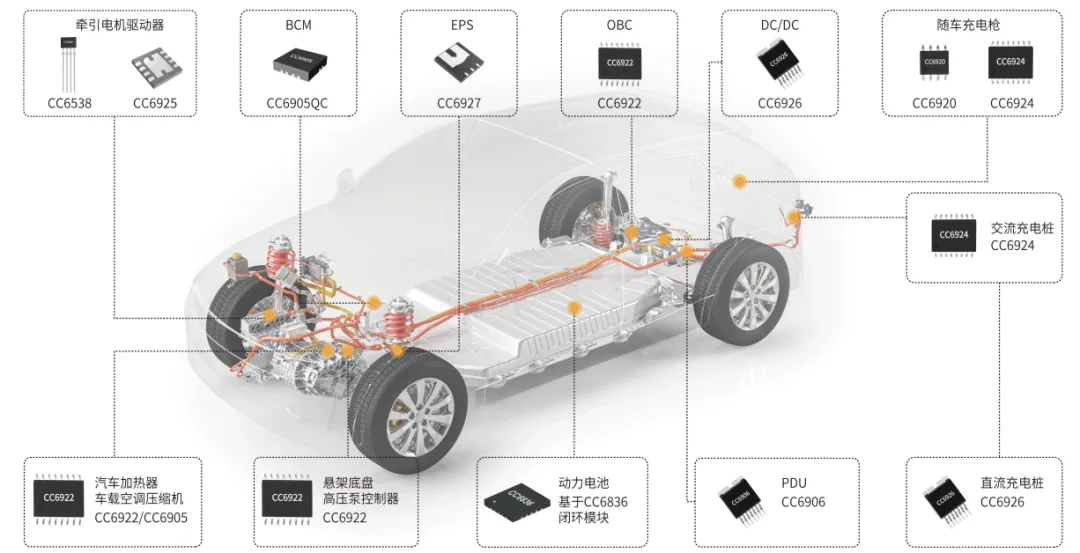 车载充电机(OBC):CC6922 等电流传感器实现充电电流精准采样、过载 / 短路保护,保障充电安全与效率。