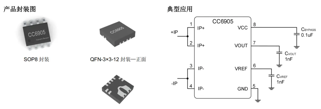 CC6905 是一款高性能霍尔效应电流传感器, 能够更有效的测量直流或交流电流, 并具有精度高、 线性度和温度稳定性好等优点, 广泛应用于工业、 消费类及通信类设备。